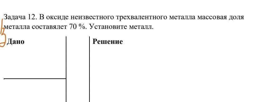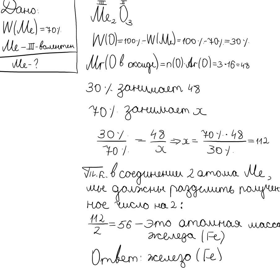 3) Ar(Me) = (ω(Me) * Mr(Me2O3)) / (N(Me) * 100%) = (70% * 160) / (2 * 100%) = 56 - Fe - железо.