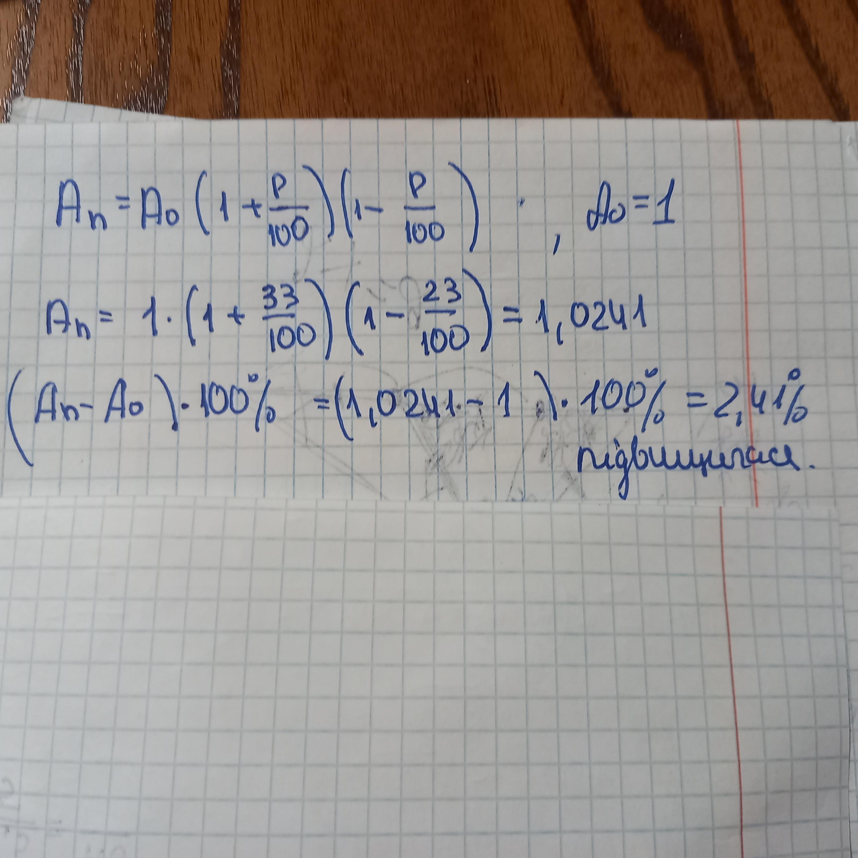 Затем цену снизили на 23% = 1,33х - 0,23 * 1,33х = 1,33х - 0,3059х = 1,0241х