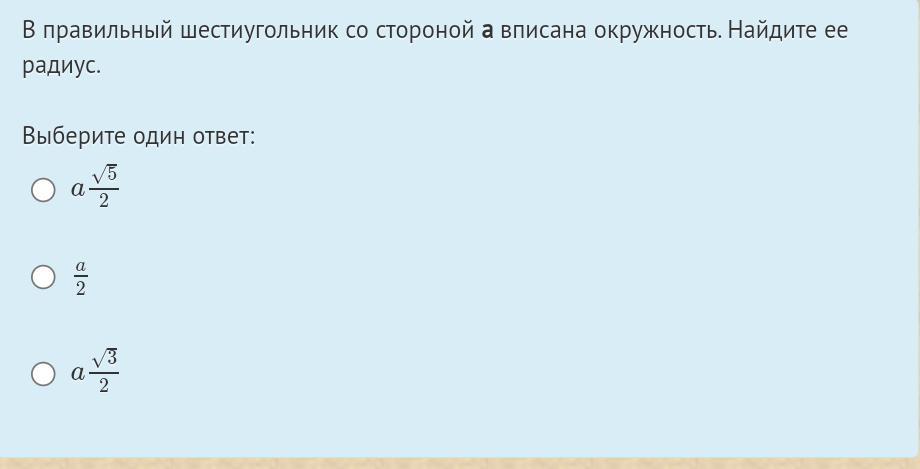 Таким образом, радиус вписанной окружности в правильном шестиугольнике равен:
