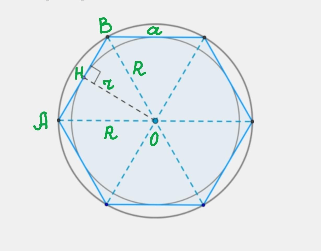 По свойству правильного шестиугольника радиус r вписанной окружности равен перпендикуляру ОН, проведённому из центра О (вписанной и описанной окружности) к стороне АВ = а.