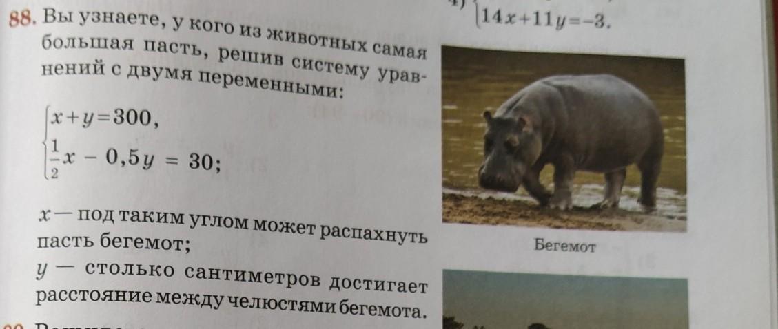 88. Вы узнаете, у кого из животных самая большая пасть, решив систему урав- нений с двумя переменными: x+y=300, 2 0,5у = 30; х - под таким углом может распахнуть пасть бегемот; у - столько сантиметров достигает расстояние между челюстями бегемота, 14x+11y=-3. Бегемот