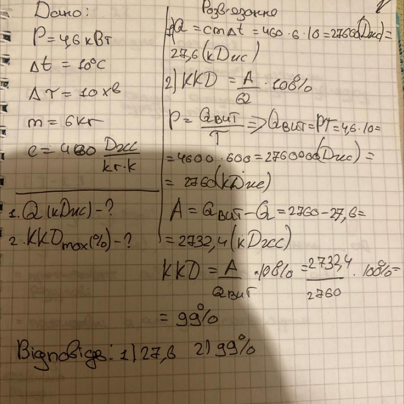 Відповідь:1)27,6КДЖ 2) 99%