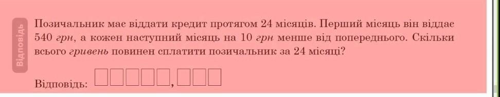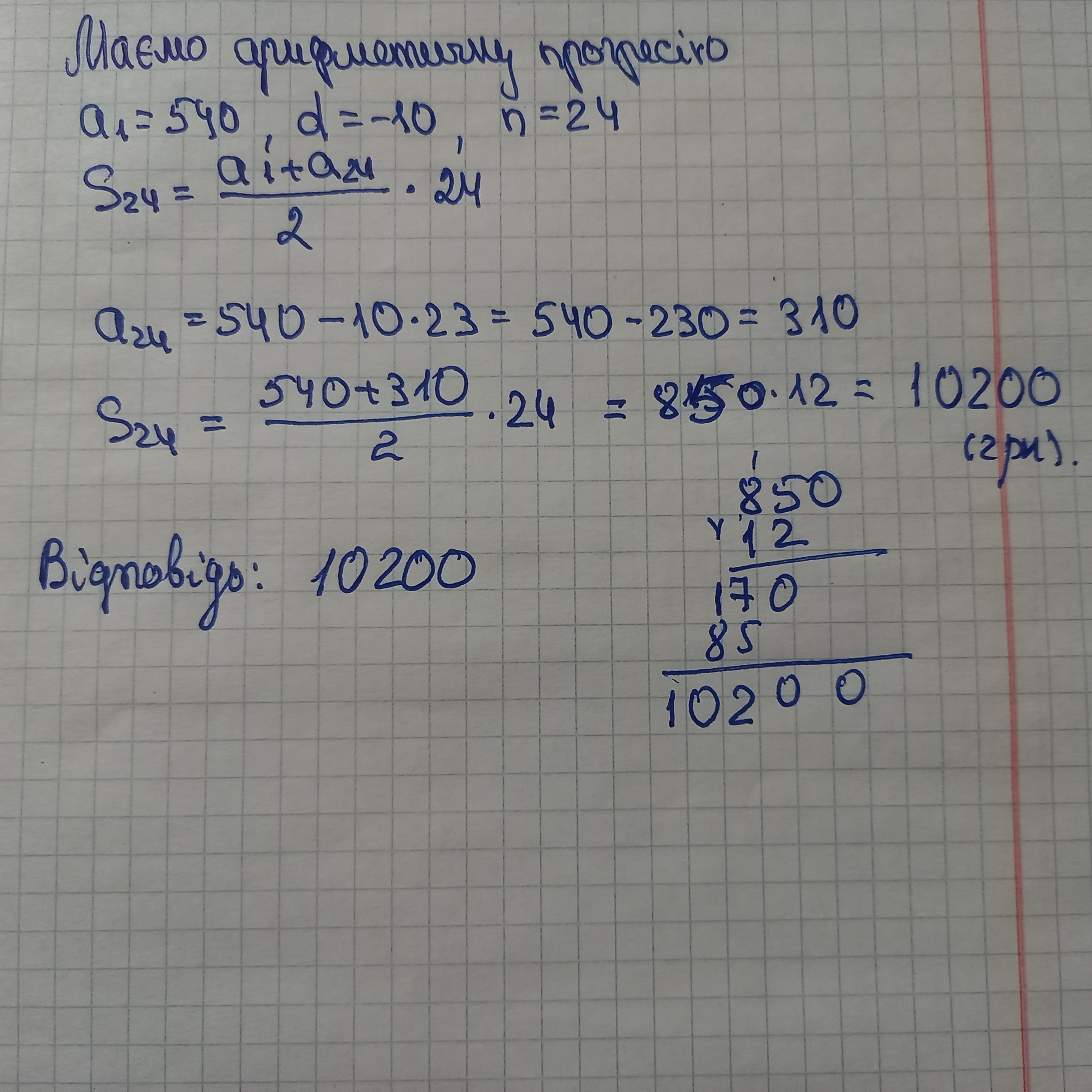 Перший член прогресії (a) дорівнює 540 грн, різниця між членами (d) дорівнює -10 грн (бо кожен місяць сума менша на 10 грн), а кількість членів (n) - 24 місяці.
