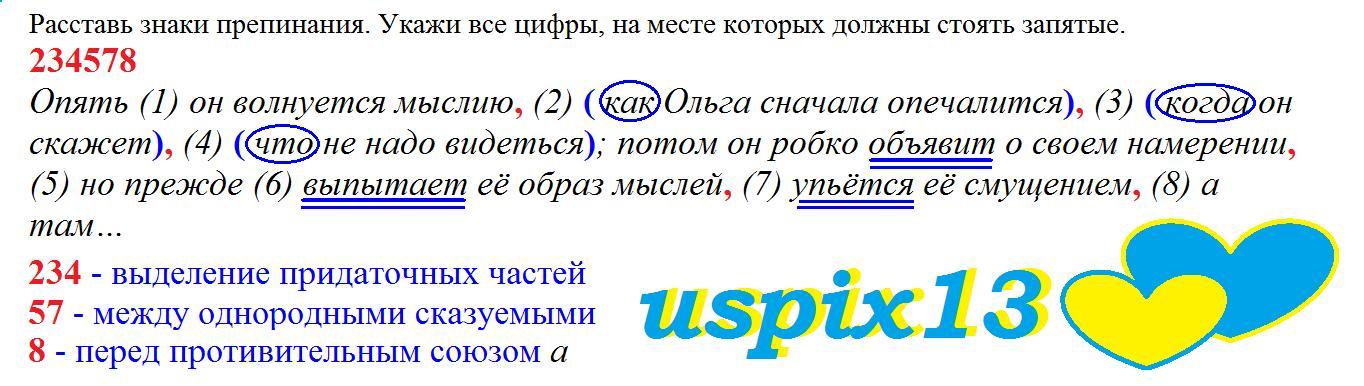 Опять (1) он волнуется мыслию (2) как Ольга сначала опечалится (3) когда он скажет (4) что не надо видеться; потом он робко объявит о своем намерении (5) но прежде (6) выпытает её образ мыслей (7) упьётся её смущением (8) а там… (И. Гончаров. Обломов)