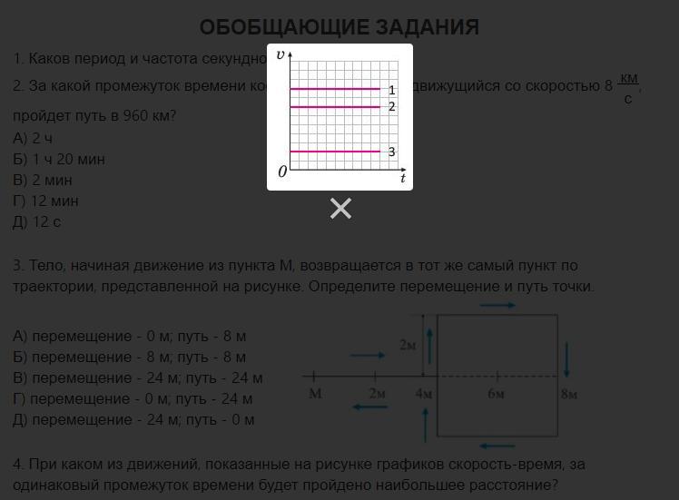При каком из движений, показанные на рисунке графиков скорость-время, за одинаковый промежуток времени будет пройдено наибольшее расстояние?