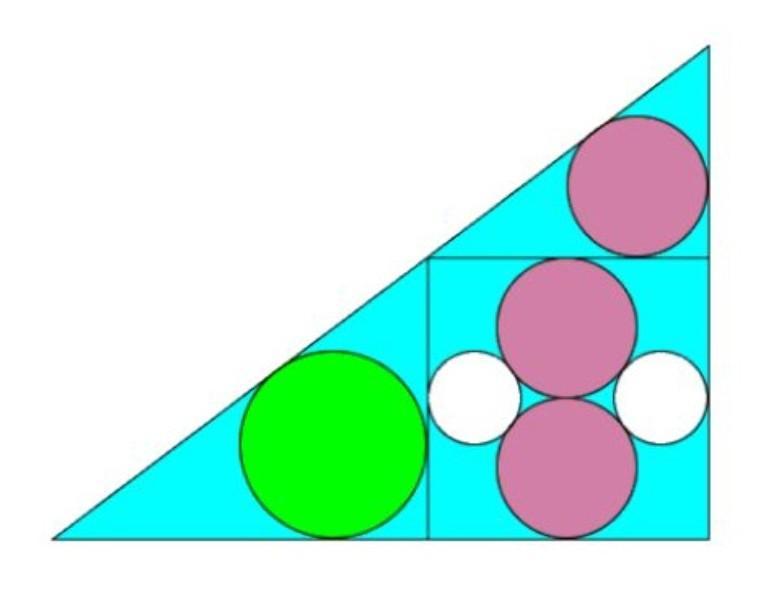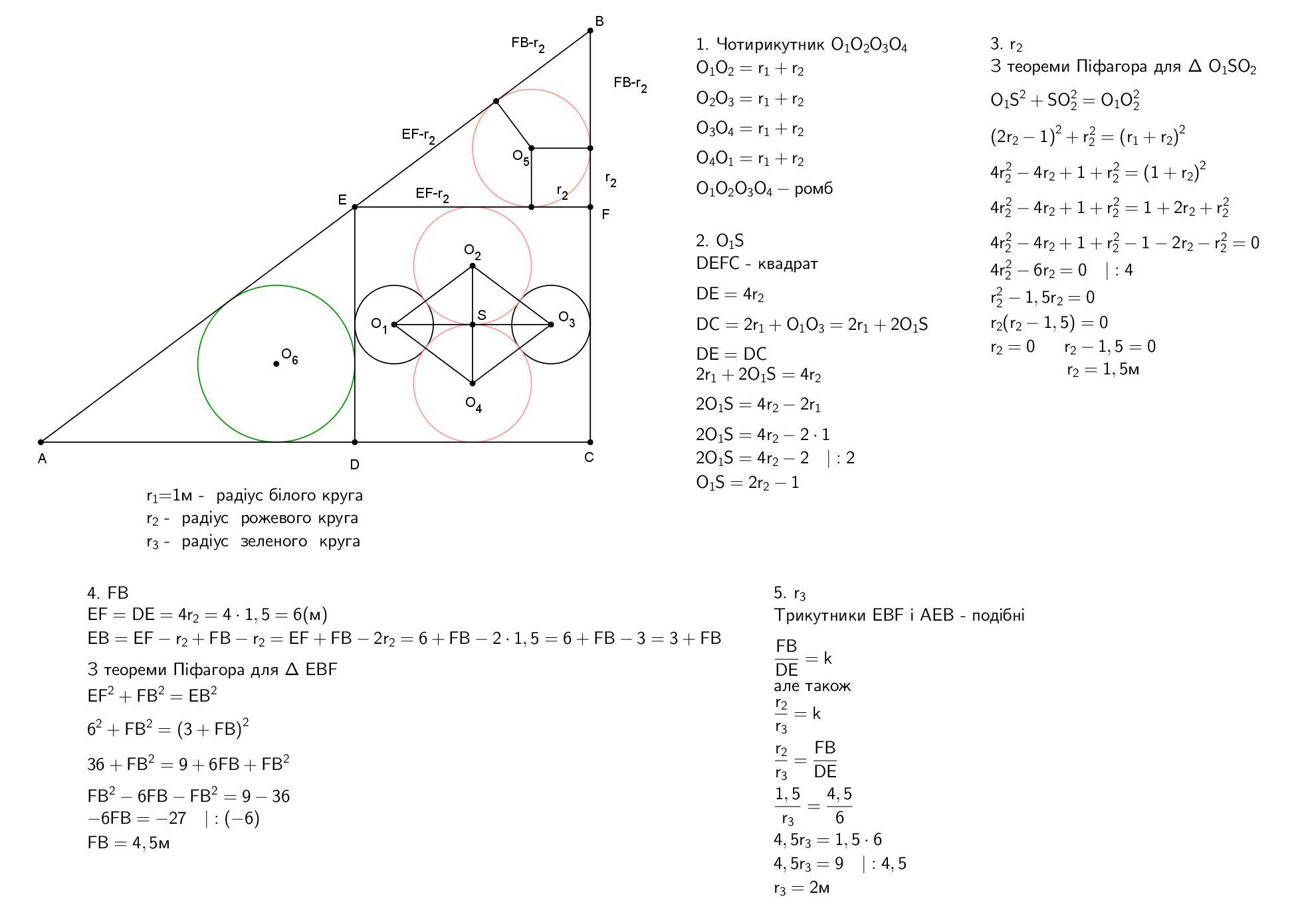 Два рожевих круга та два білих круга радіуса 1м вписані в квадрат, як показано на рис. Квадрат вписано в трикутник разом із двома кругами. Знайдіть радіус зеленого круга.