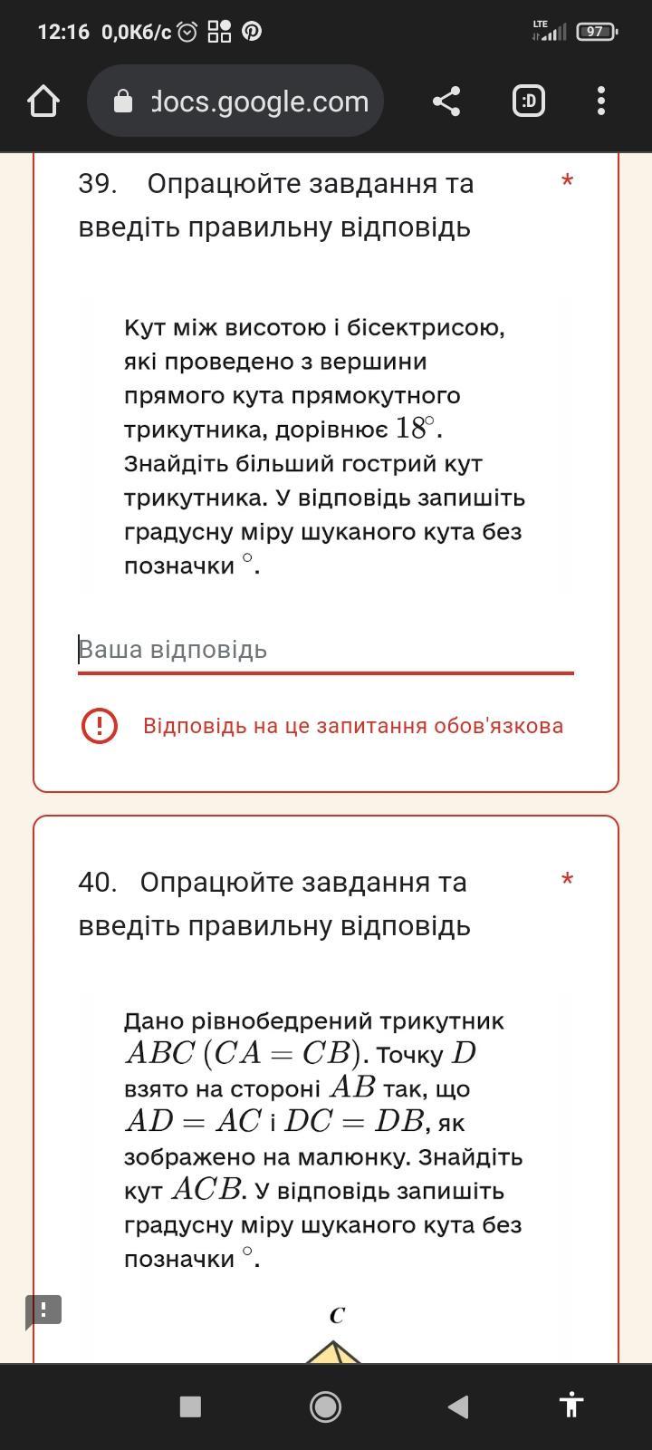 У місці перетину з гіпотенузою трикутника висота утворює два прямих кути, адже є перпендикуляром. Отже, утворюється маленький трикутник з кутом 90°, кутом 27° та невідомим кутом з великого трикутника.