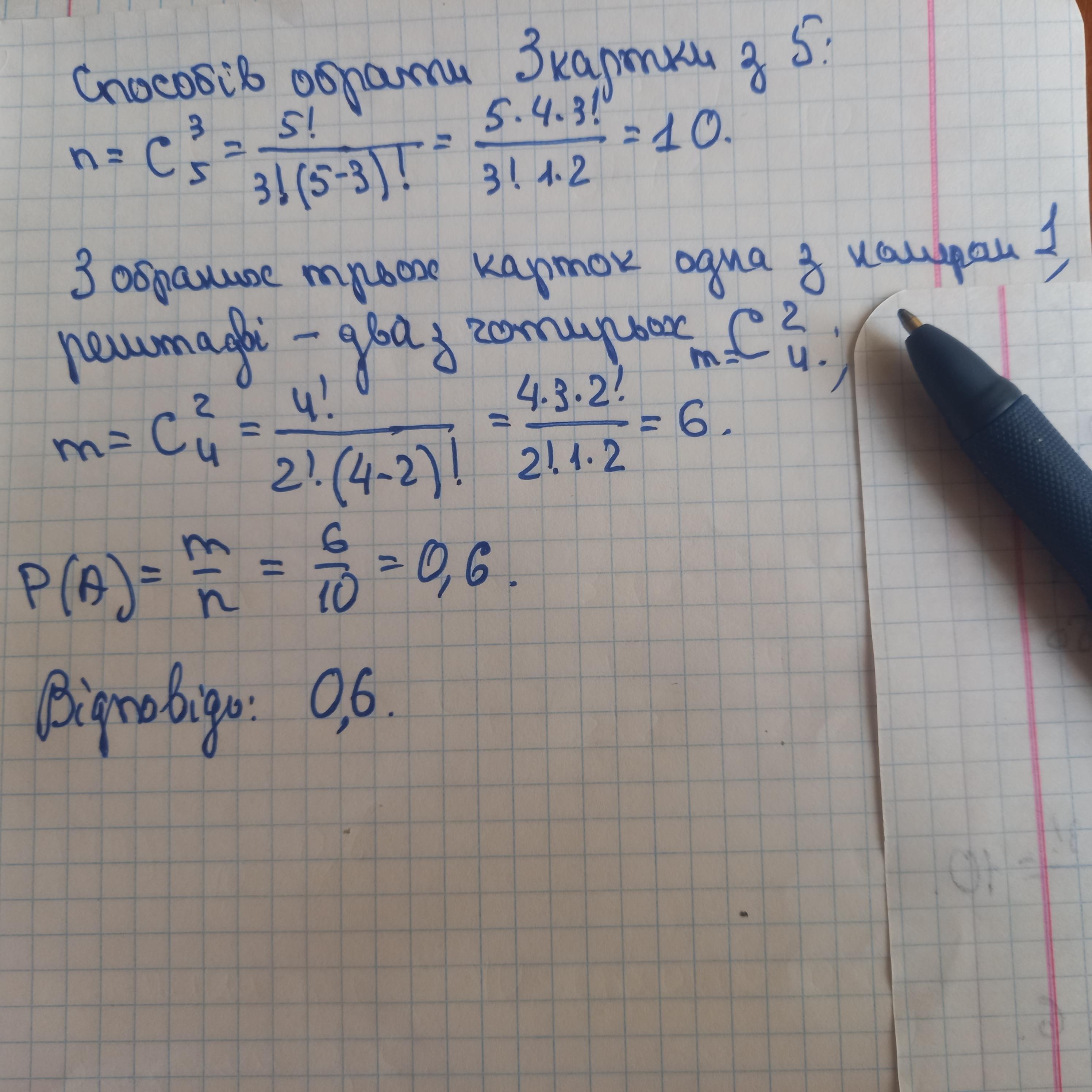 5. На п'яти картках написані цифри від 1 до 5. Навмання беруть 3 картки. Яка імовірність того, що серед них буде картка з номером 1. Допоможіть, будь ласка