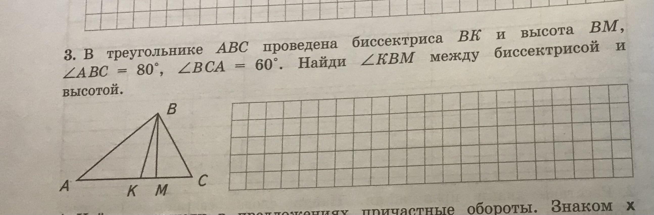 так как треугольник ВМС-прямоугольный, то ∠МВС=90°-∠ВСА=90°-60°=30°, и с учетом того, что ВК -биссектриса, то ∠KBM=40°-30°=10°