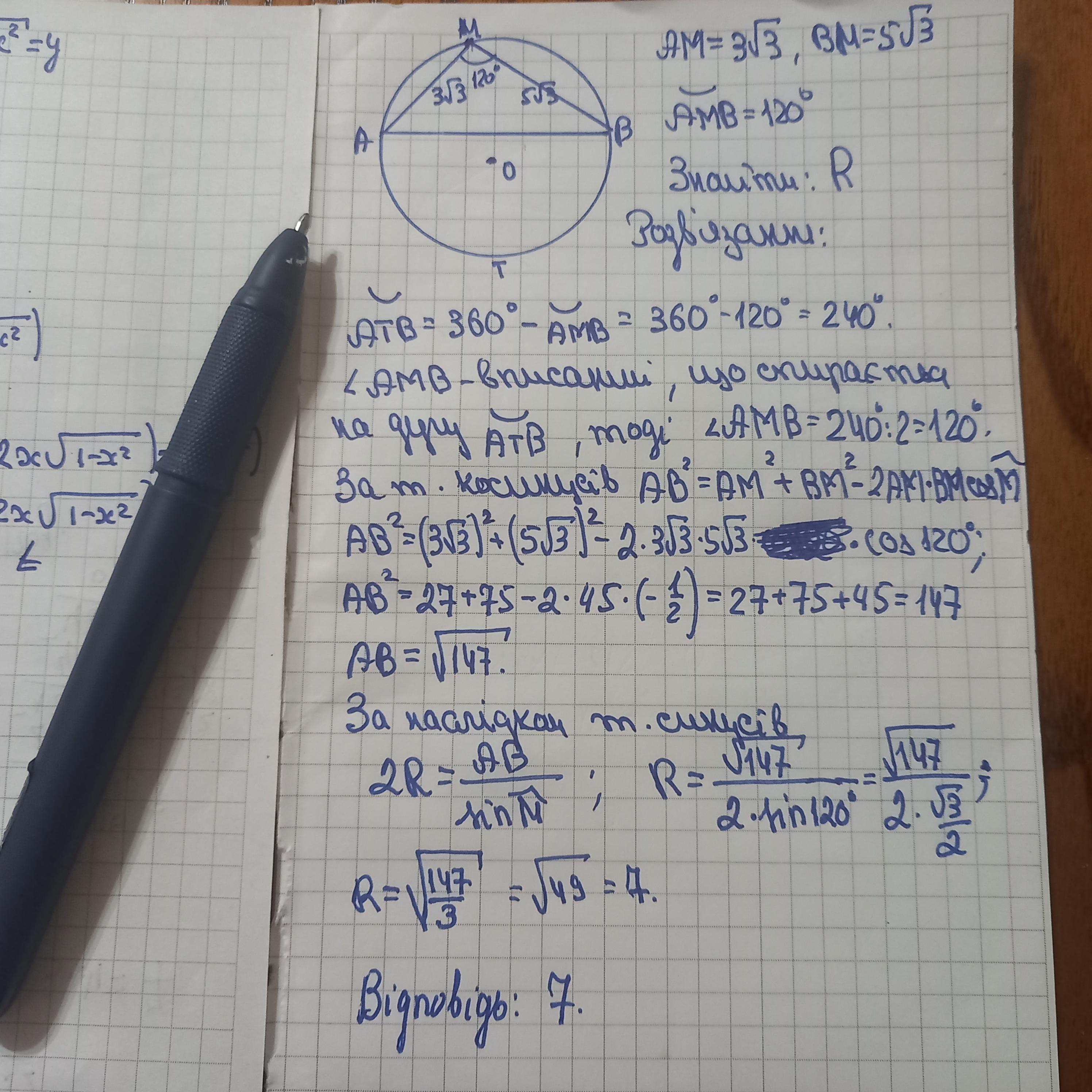 3 точки кола проведено хорди, довжини яких 3√3 і 5√3 Кінці цих хорд сполучено відрізком, який стягує дугу 120°. Обчисліть радіус кола, якщо відрізок і точка лежать по один бік від центра кола
