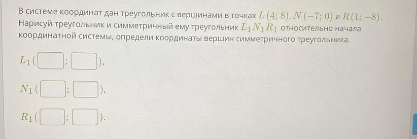 Нарисуй треугольник и симметричный ему треугольник L1 N1 R1 относительно начала координатной системы, определи координаты вершин симметричного треугольника.