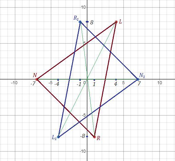 Точки L₁(-4 ; -8) , N₁( 7 ; 0 ) , R₁(-1 ; 8 ) симметричны точкам L( 4 ; 8 ) ,