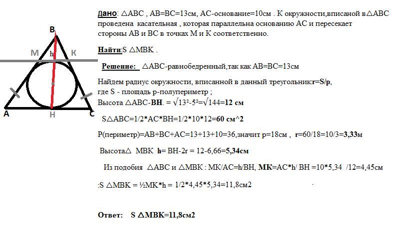 В треугольнике АВС известно, что АВ=ВС=13см, АС=10см. К окружности, вписанной в этот треугольник, проведена касательная, которая параллельна основанию АС и пересекает стороны АВ и ВС в точках М и К соответственно. Вычислите площадь треугольника МВК. (Составьте рисунок)
