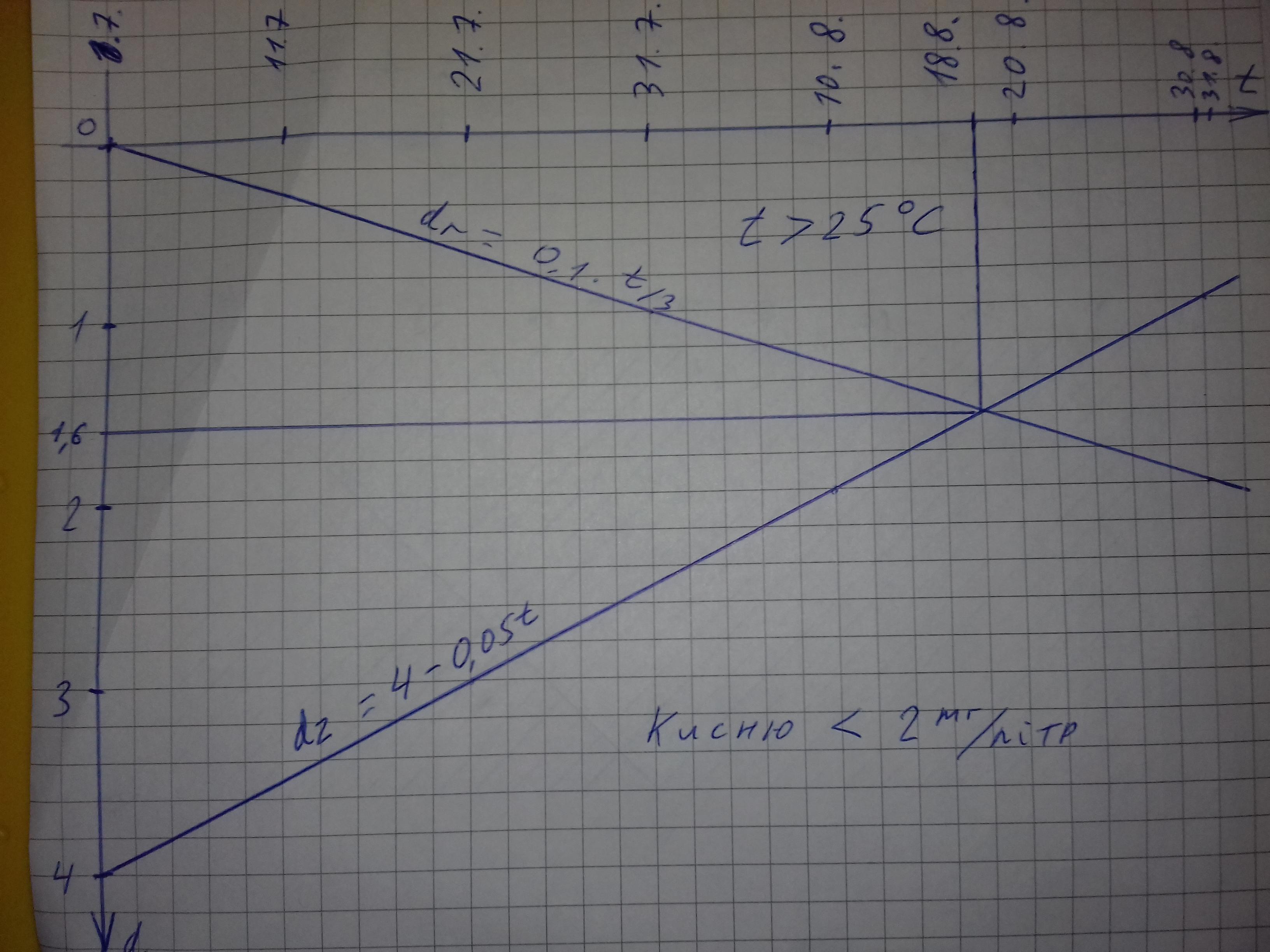 4) Побудуємо графіки для dr та dz. Вісь глибини ( d ) спрямована по вертикалі вниз. Вісь часу ( t ) спрямована горизонтально справа наліво. На перетині двох графіків знаходимо точку ( граничне значення, за якого окунь неможе вижити в озері ). Зверху на графіком dr температура вища за 25°С, а знизк під графіком dz концентрація кисню меньша за 2 мг на літр.