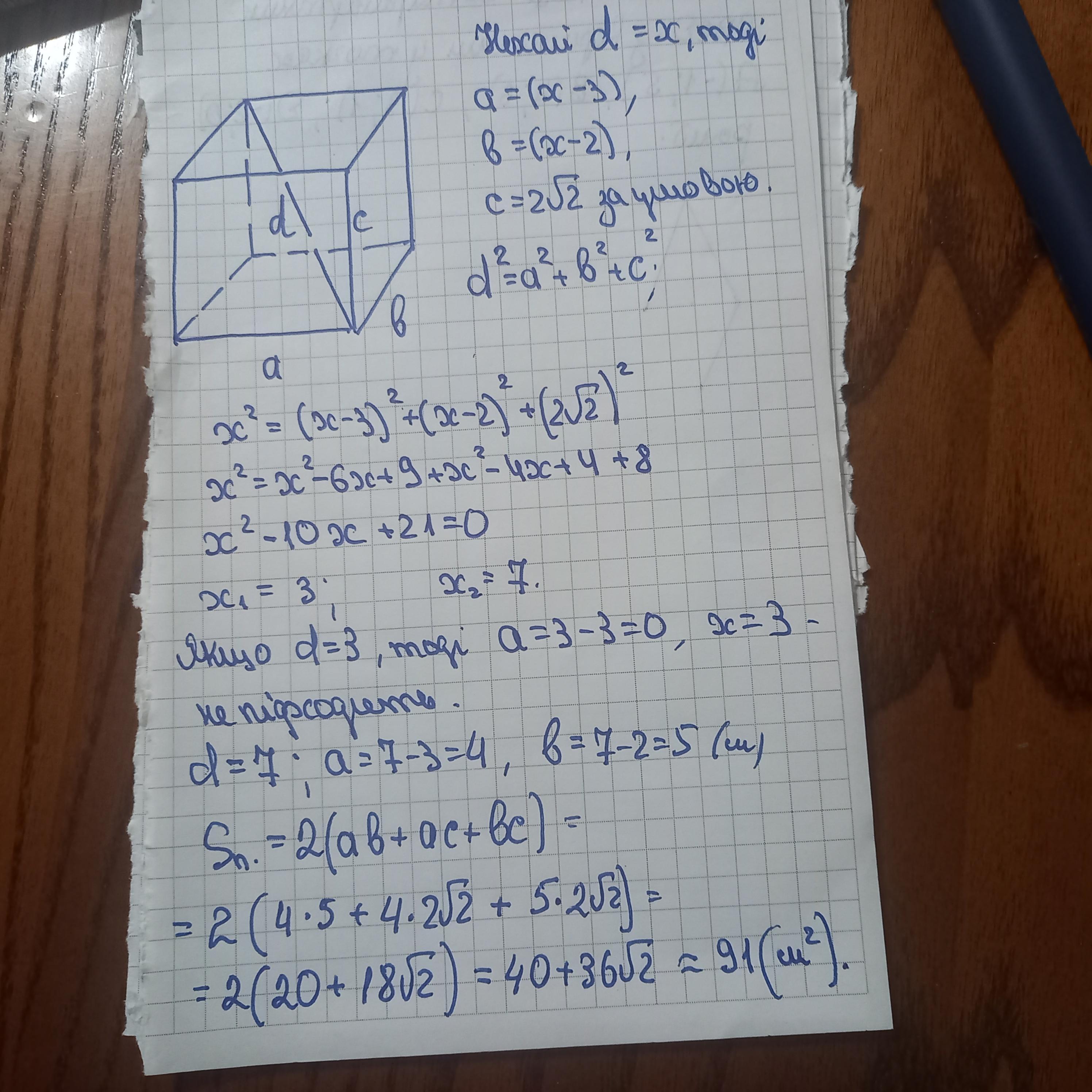 діагональ прямокутного паралелепіпеда більша за сторони основи на 3 см і 2 см. Знайдіть площу його повної поверхні, якщо висота паралелепіпеда дорівнює 2√2