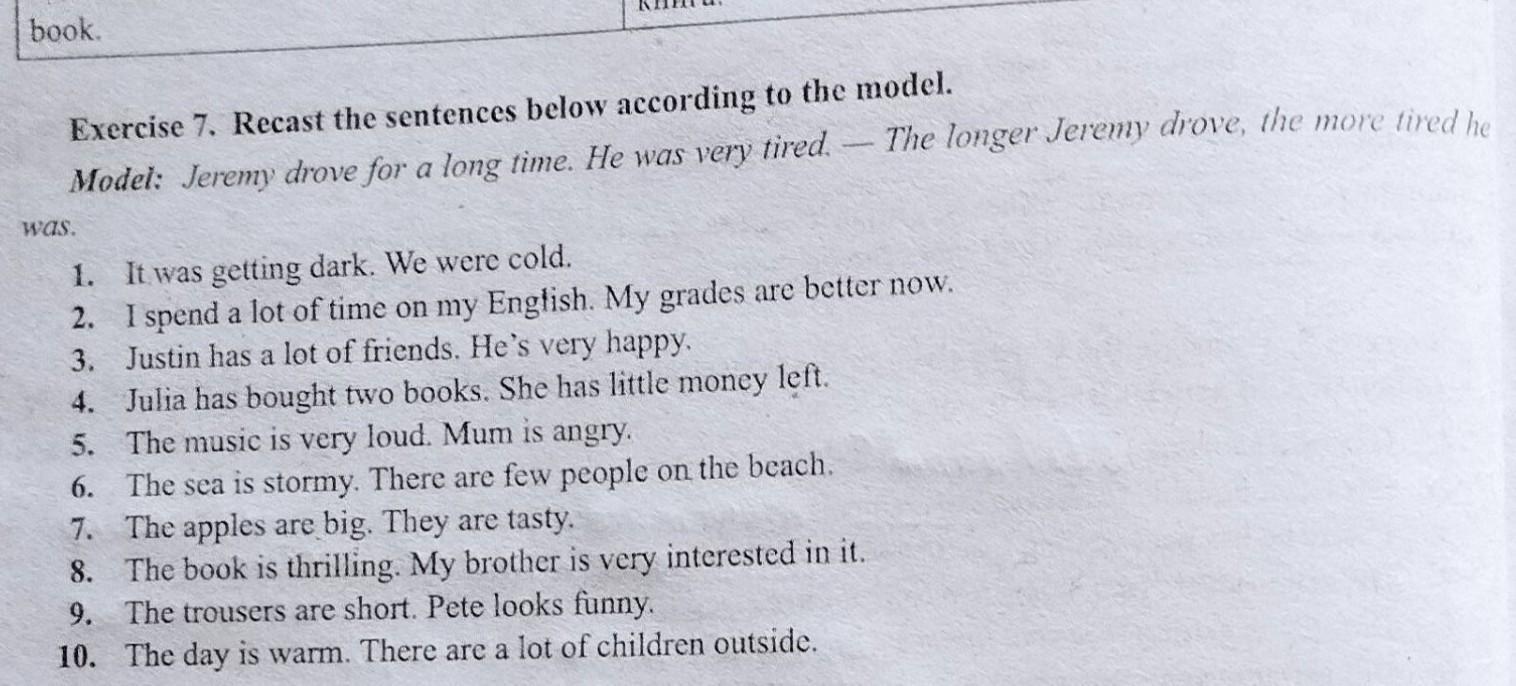 Exercise 7. Recast the sentences below according to the model. Model: Jeremy drove for a long time. He was very tired. was. The longer Jeremy drove, the more tired he 1. It was getting dark. We were cold. 2. I spend a lot of time on my English. My grades are better now. 3. Justin has a lot of friends. He's very happy. 4. Julia has bought two books. She has little money left. 5. The music is very loud. Mum is angry. 6. The sea is stormy. There are few people on the beach. 7. The apples are big. They are tasty. 8. The book is thrilling. My brother is very interested in it. 9. The trousers are short. Pete looks funny. 10. The day is warm. There are a lot of children outside.