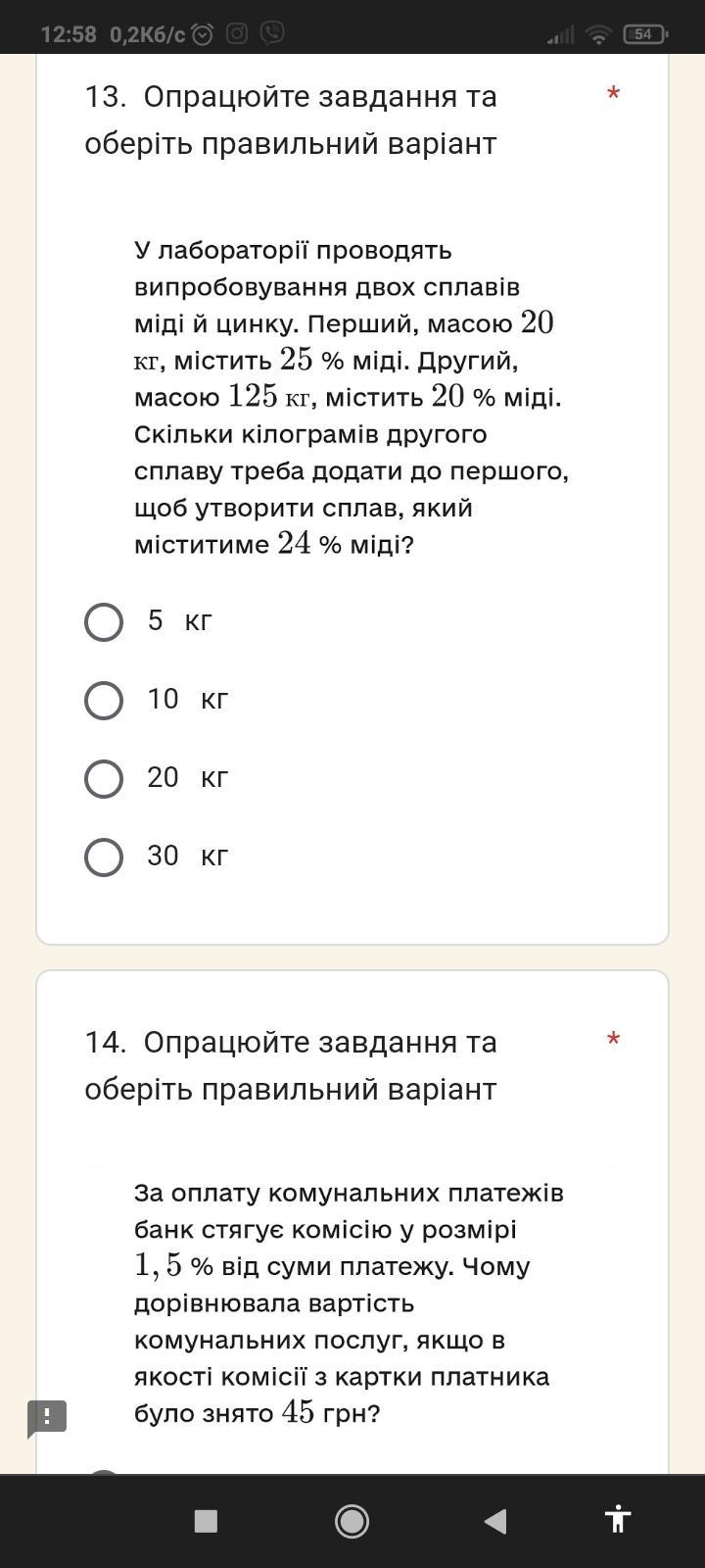 13. 1. Масса 20, меди 25%*20=0,25*20=5; 3. Добавляем из 2 Масса m, меди в нём 0,2*m. Получилось Общая масса (20+m), меди в ней (5+0,2m). По условию (5+0,2m)/(20+m) = 0.24;Умножим на 100, чтобы легче считать 500+20m=24(m+20); 500+20m=24m+480; 4m=20; m=5кг; Зачем дана масса второго сплава, непонятно, наверное, убедиться в том, что его хватит. А его хватило, так как 5 < 125.