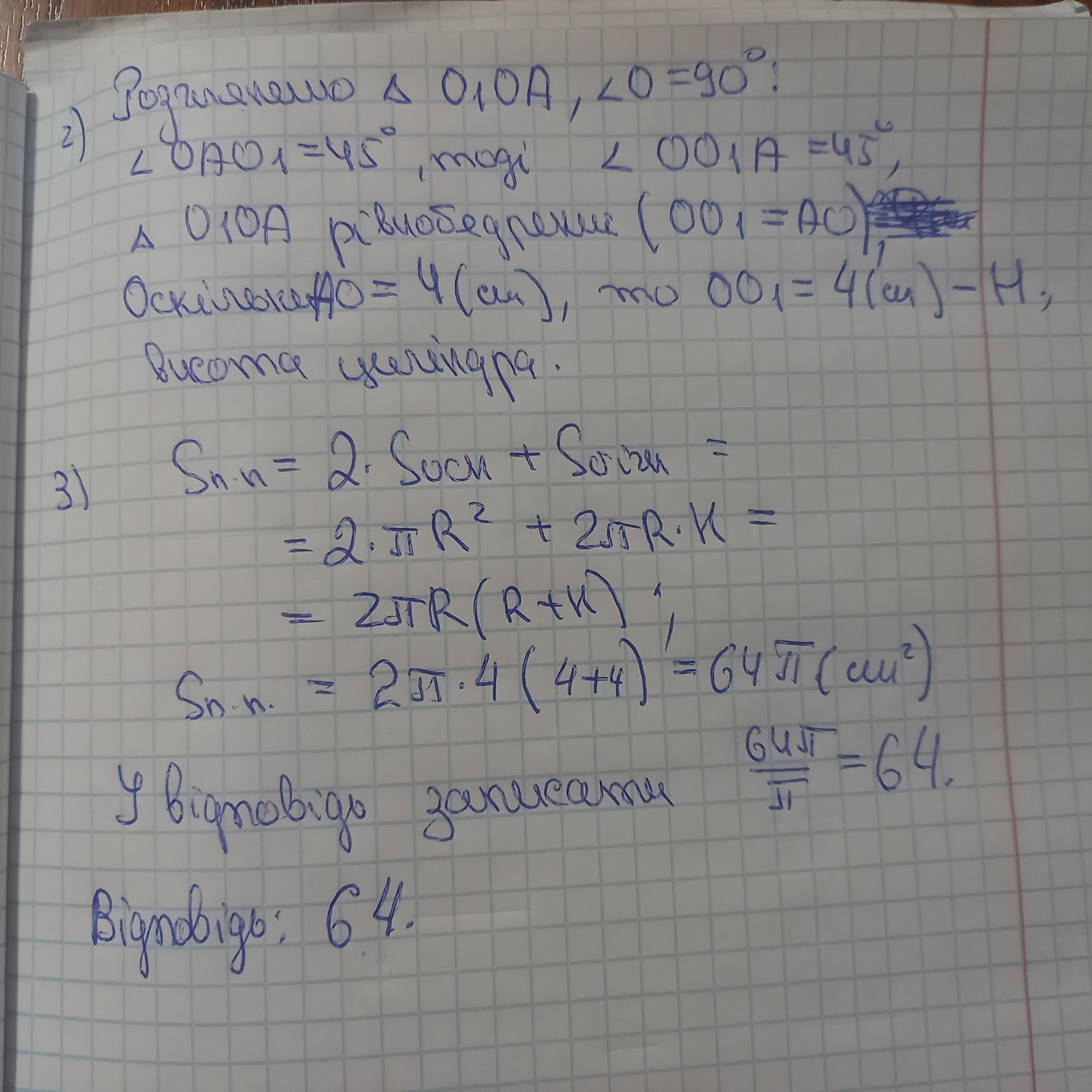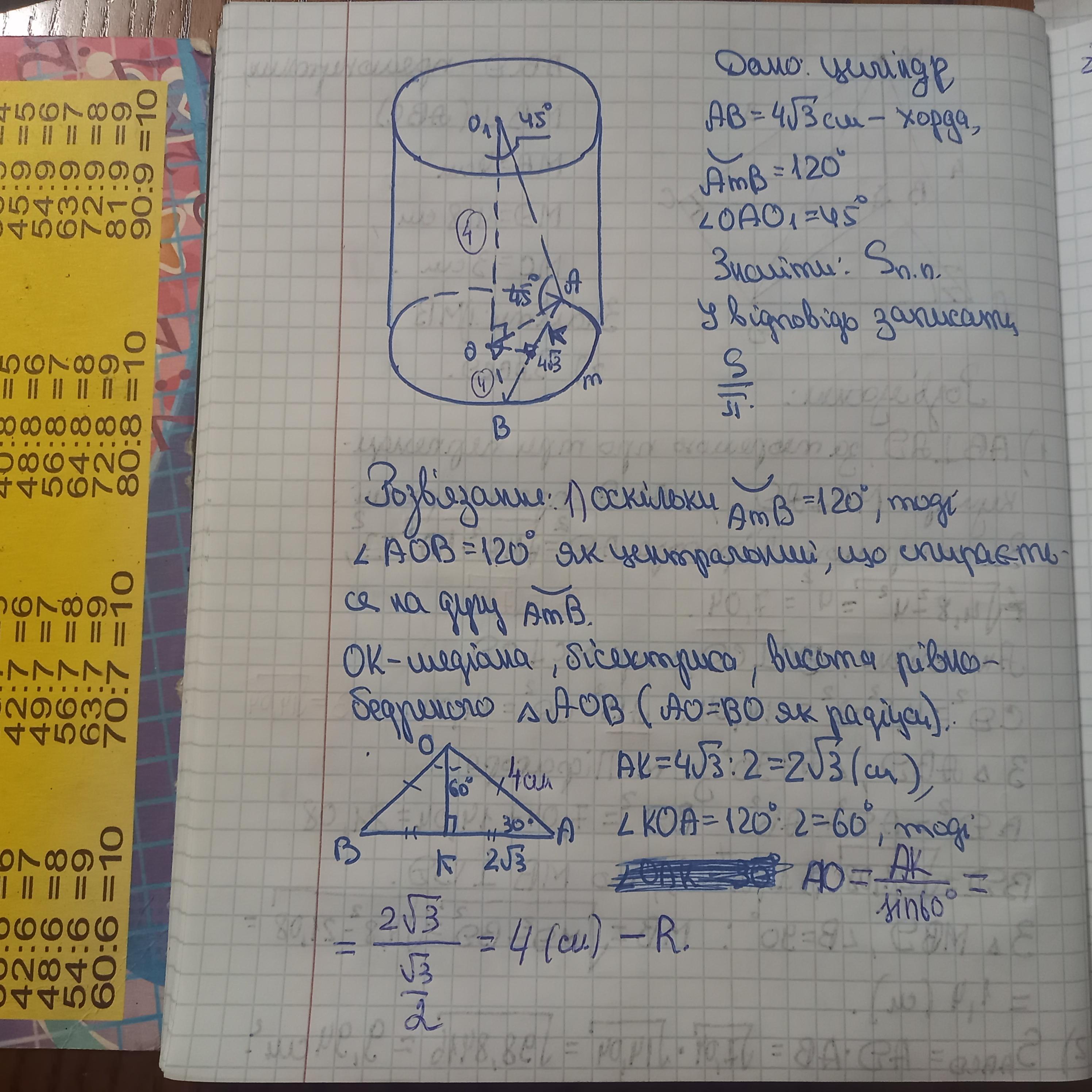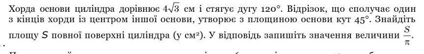 Хорда основи циліндра дорівнює 4sqrt(3) см і стягує дугу 120 deg . Відрізок, що сполучає один з кінців хорди із центром іншої основи, утворює з площиною основи кут 45 deg Знайдіть площу 5 повної поверхні циліндра ( YC * M ^ 2 ). У відповідь запишіть значення величини S/pi