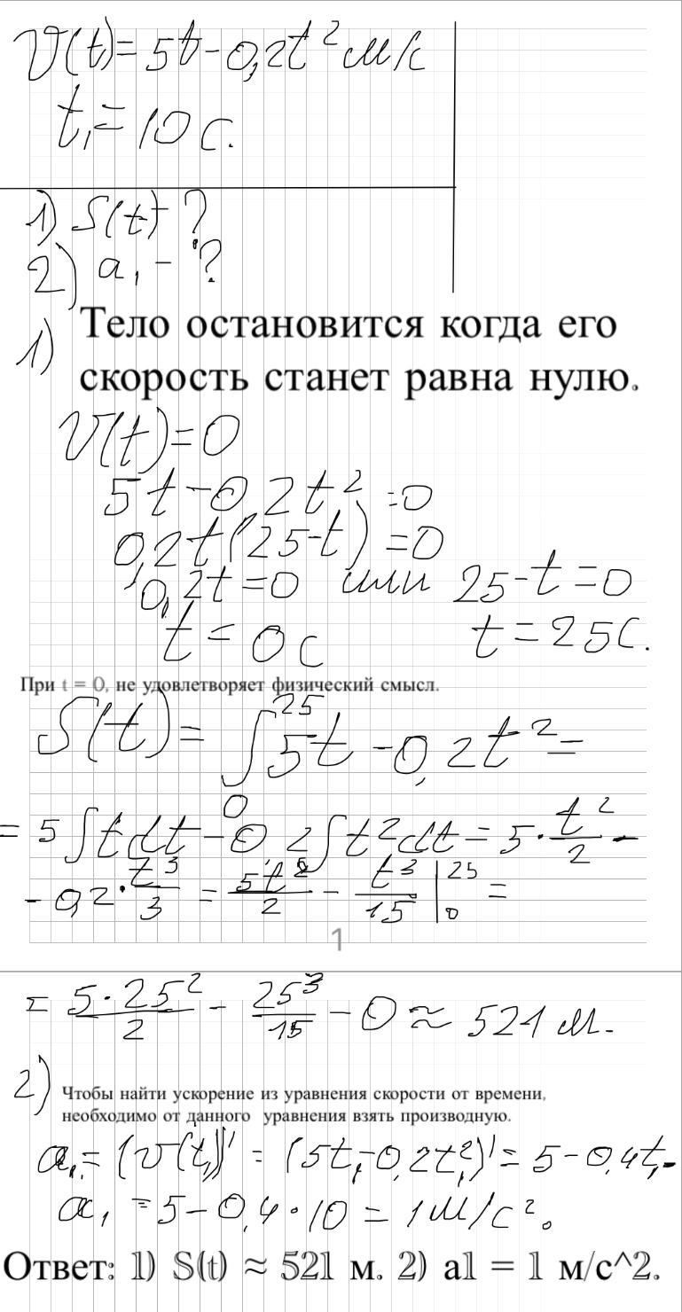 поможіть. Тіло рухається прямолінійно зі швидкістю v(t) = 5t - 0,2t^2 (м/с). Знайдіть: 1) переміщення та в початку руху до зупинки; 2) прискорення тiла в момент часу t = 10 c.