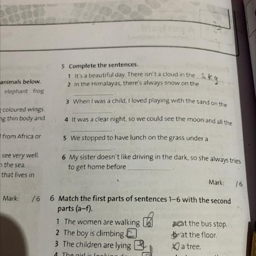 1. It's a beautiful day. There isn't a cloud in the sky. 2. In the Himalayas, there's always snow on the peaks. 3. When I was a child, I loved playing with the sand on the beach. 4. It was a clear night, so we could see the moon and all the stars. 5. We stopped to have lunch on the grass under a shady tree. 6. My sister doesn't like driving in the dark, so she always tries to get home before nightfall.