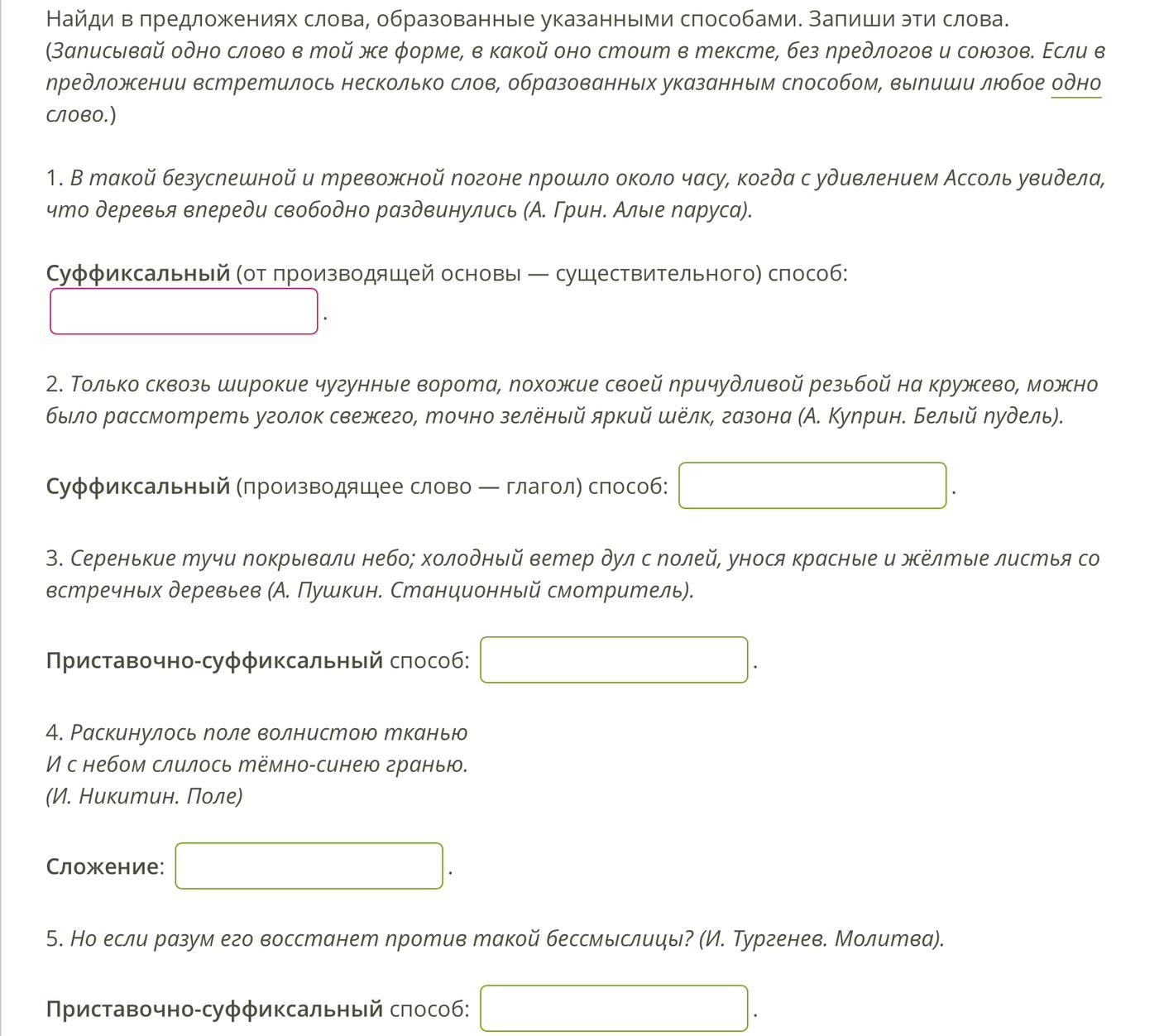 (Записывай одно слово в той же форме, в какой оно стоит в тексте, без предлогов и союзов. Если в предложении встретилось несколько слов, образованных указанным способом, выпиши любое одно слово.)