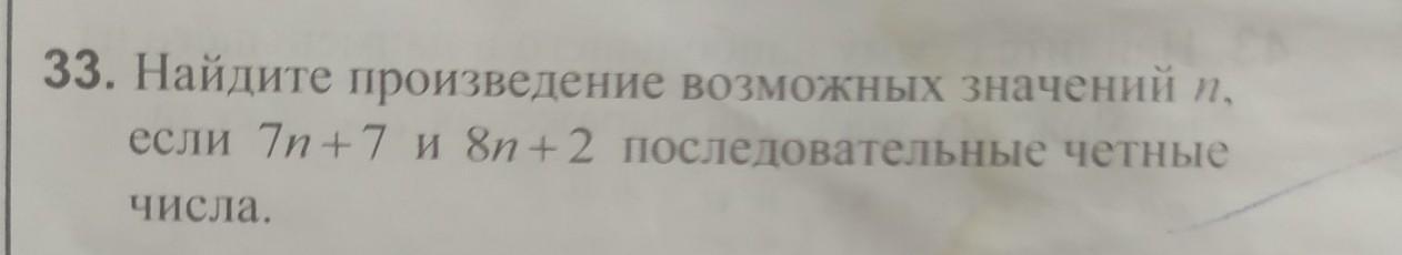 33. Найдите произведение возможных значений п если 7и+7 и 8n + 2 последовательные четные числа.