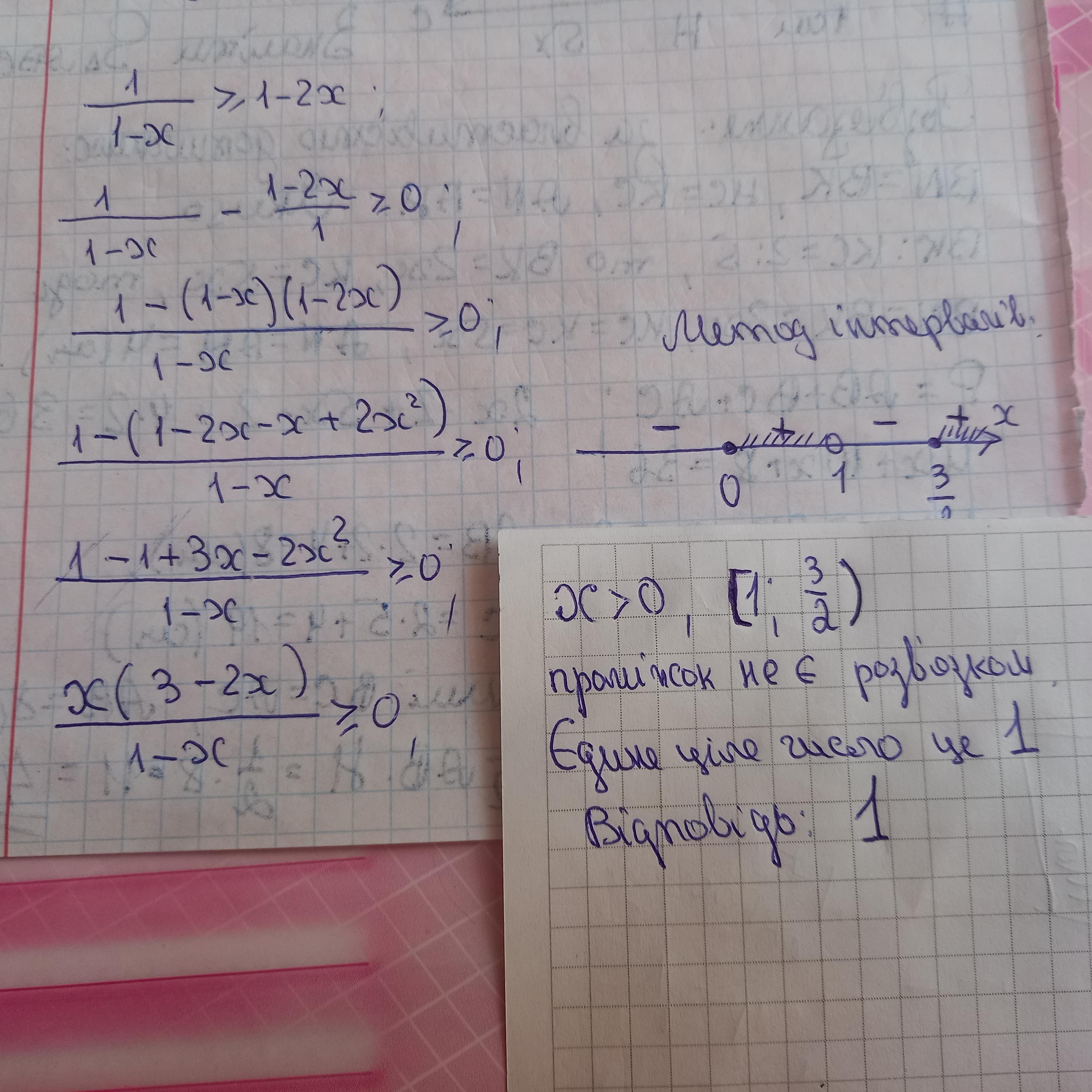 Розв'язати нерівність 1/1-x≥1-2x. У відповідь записати суму всіх додатних цілих чисел, які не є розв'язками нерівності