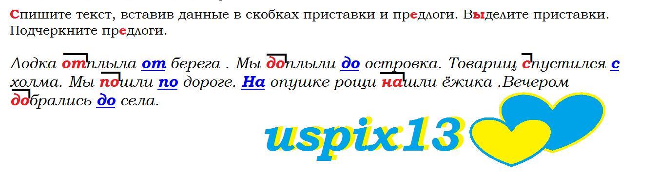 спишите текст ,вставив данные в скобках приставки и придлоги.Веделите приставки Подчеркните придлоги. Лодка (от) плыла (от) берега . Мы (до) плыли ( до) островка. Товарищ (с) пустился (с) холма. Мы ( по) шли ( по ) дороге. (На ) опушке рощи ( на )шли ёжика .Вечером (до) брались ( до ) села.