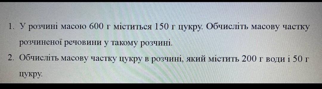 2)Обчисліть масову частку цукру в розчині, який містить 200 г води і 50 г цукру.