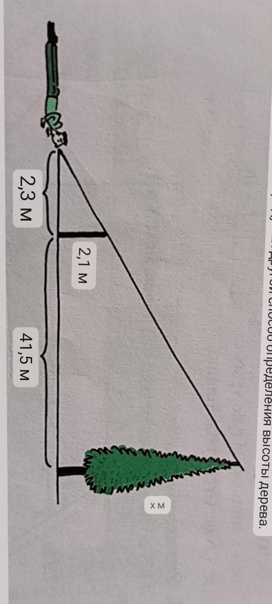 Он воткнул вертикальный шест в землю и нашел место, откуда он мог видеть одним глазом верхушку дерева с земли, сразу за верхним концом шеста. Он измерил расстояние глаза от шеста — 2,3 м, расстояние шеста от дерева — 41,5 м, а высоту шеста — 2,1 м.