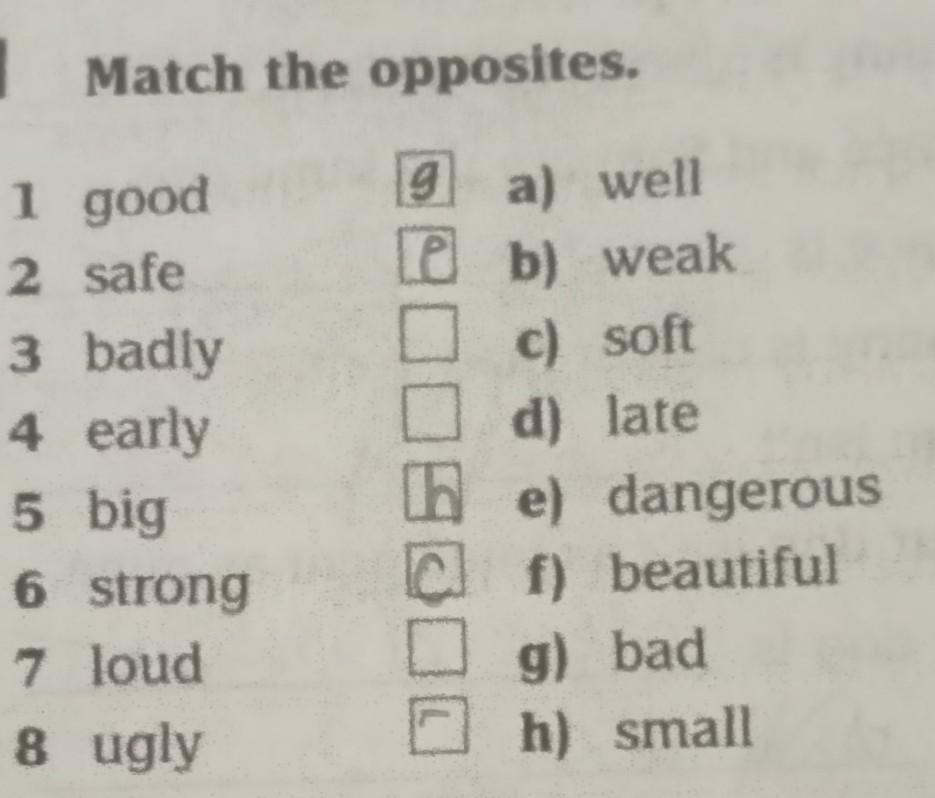 Vocabulary: opposites 1 Match the opposites. 1 2 good safe 3 4 5 big 6 strong 7 loud 8 ugly badly early 9 DI a) well b) weak c) soft d) late e) dangerous f) beautiful g) bad h) small