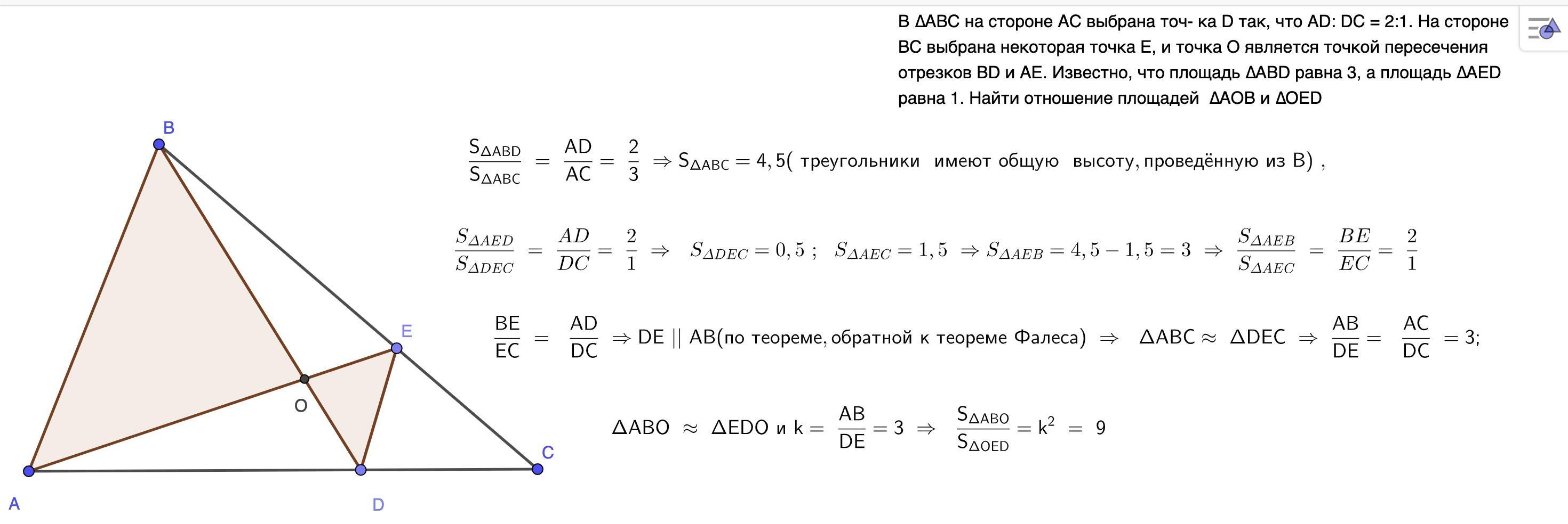 В ∆АВС на стороне АС выбрана точ- ка D так, что AD: DC = 2:1. На стороне ВС выбрана некоторая точка Е, и точка О является точкой пересечения отрезков BD и АЕ. Известно, что площадь ∆ABD равна 3, а площадь ∆AED равна 1. Найти отношение площадей ∆АОВ и ∆OED