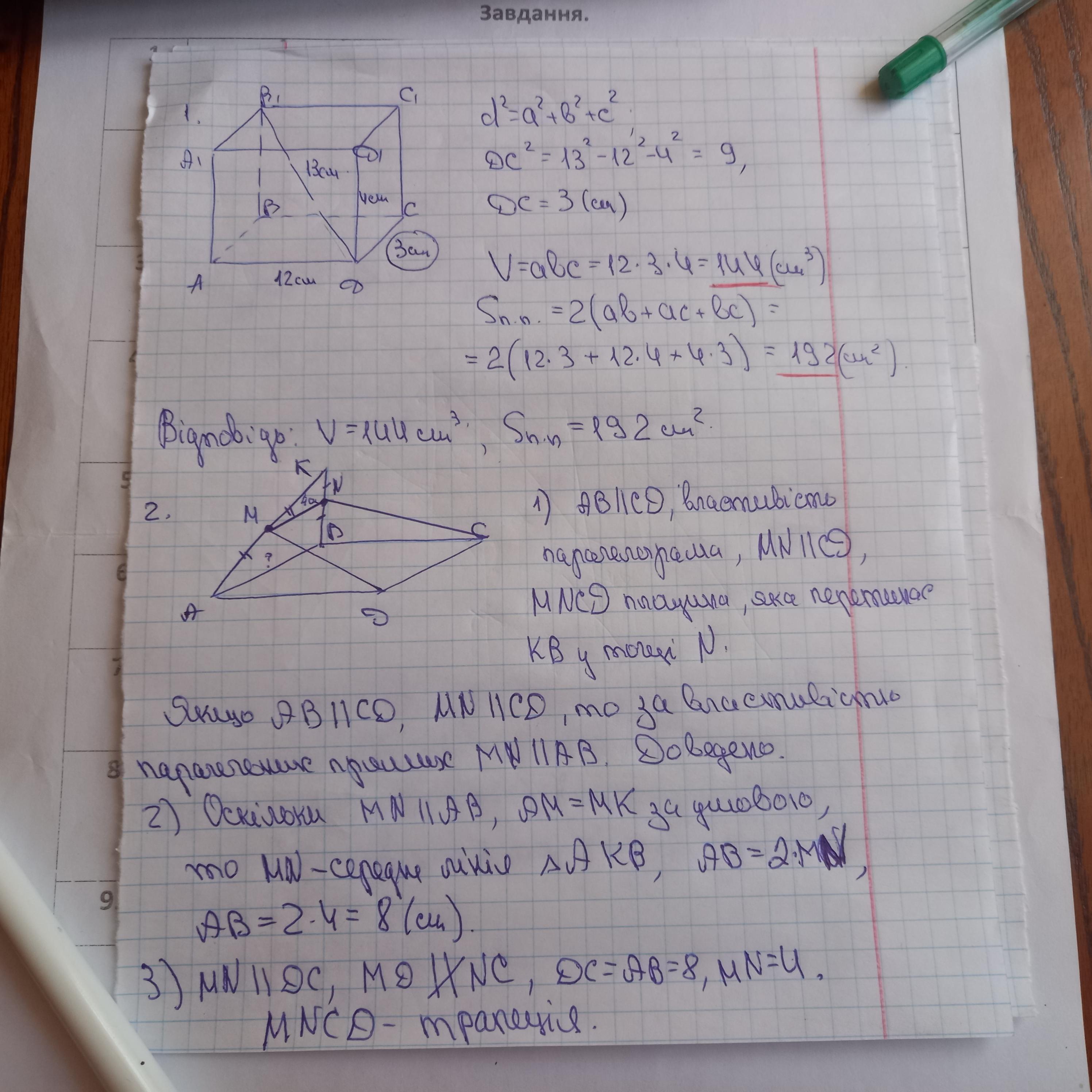 1) Довжина основи прямокутного паралелепіпеда дорівнюе 12 см, а висота паралелепіпеда - 4 см. Знайдіть об’єм та площу повної поверхні паралелепіпеда, якщо