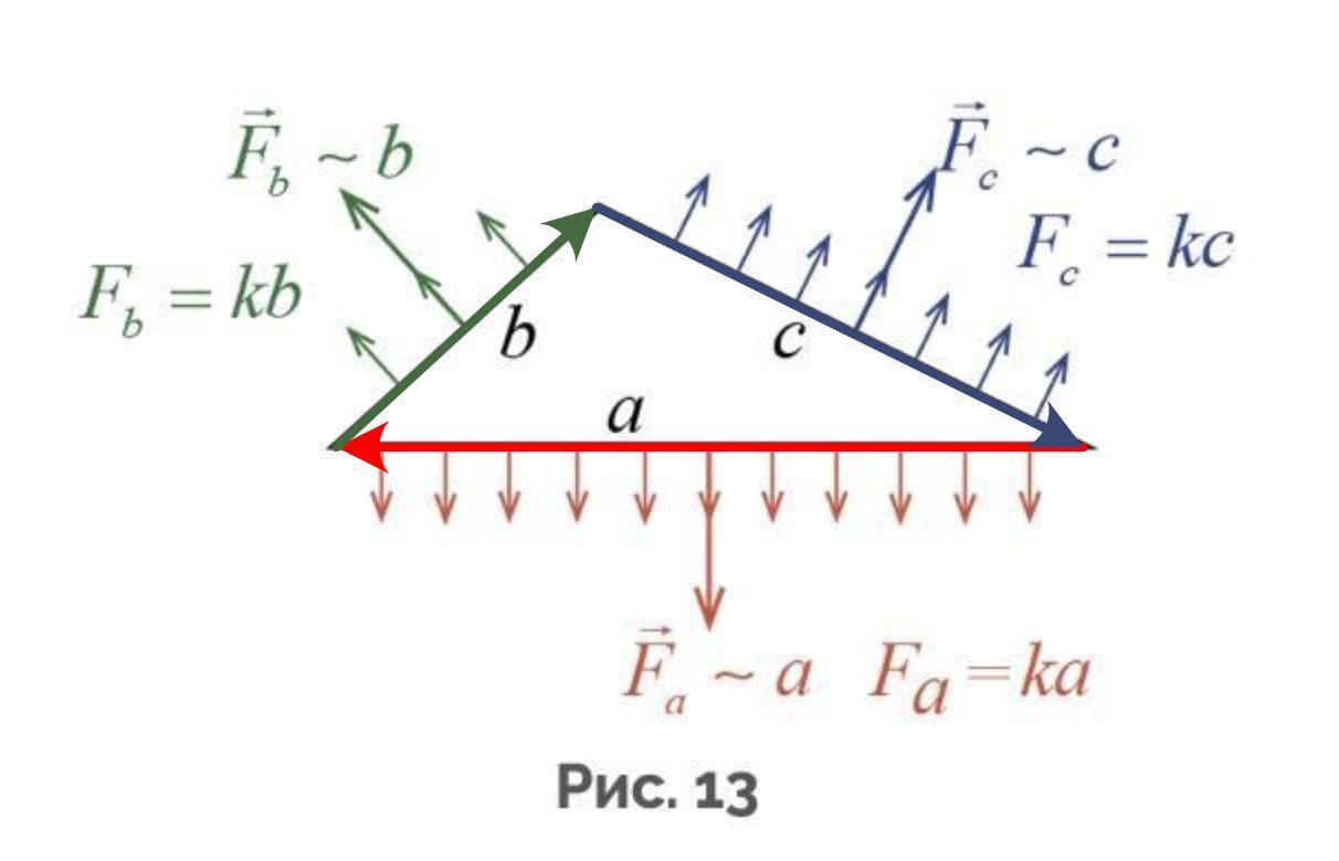 Где - единичный вектор, направленный на нас. Обратим внимание, что записанные таким образом силы удовлетворяют как условию пропорциональности (сила пропорциональна длине стороны), так и перпендикулярности, и направления сил тоже оказываются правильными, при правильном выборе векторов