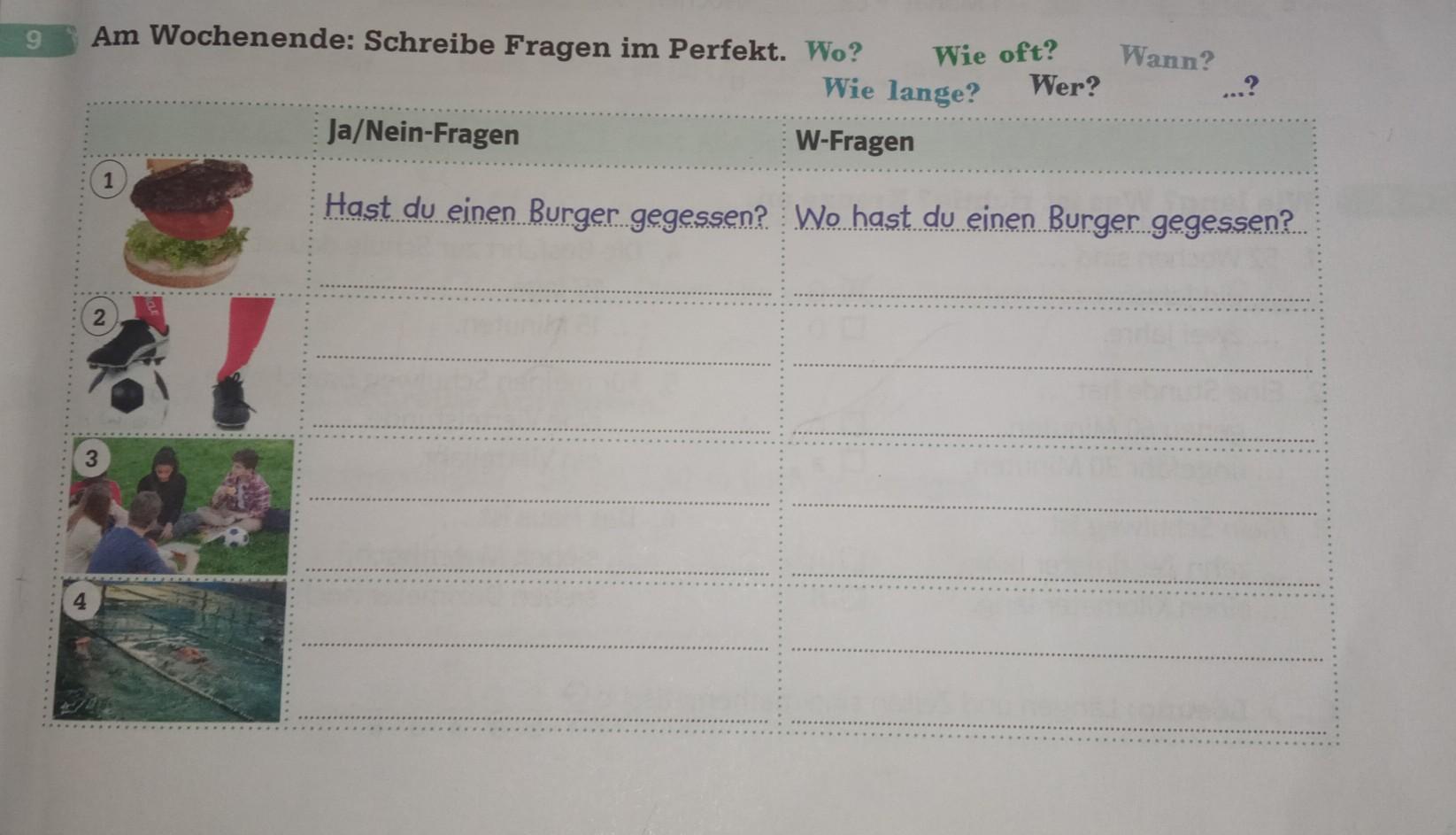 Am Wochenende: Schreibe Fragen im Perfekt. Wo? 4 (1) 2 3 300 Wie oft? Wer? Wie lange? W-Fragen Wann? Ja/Nein-Fragen Hast du einen Burger gegessen? Wo hast du einen Burger gegessen?