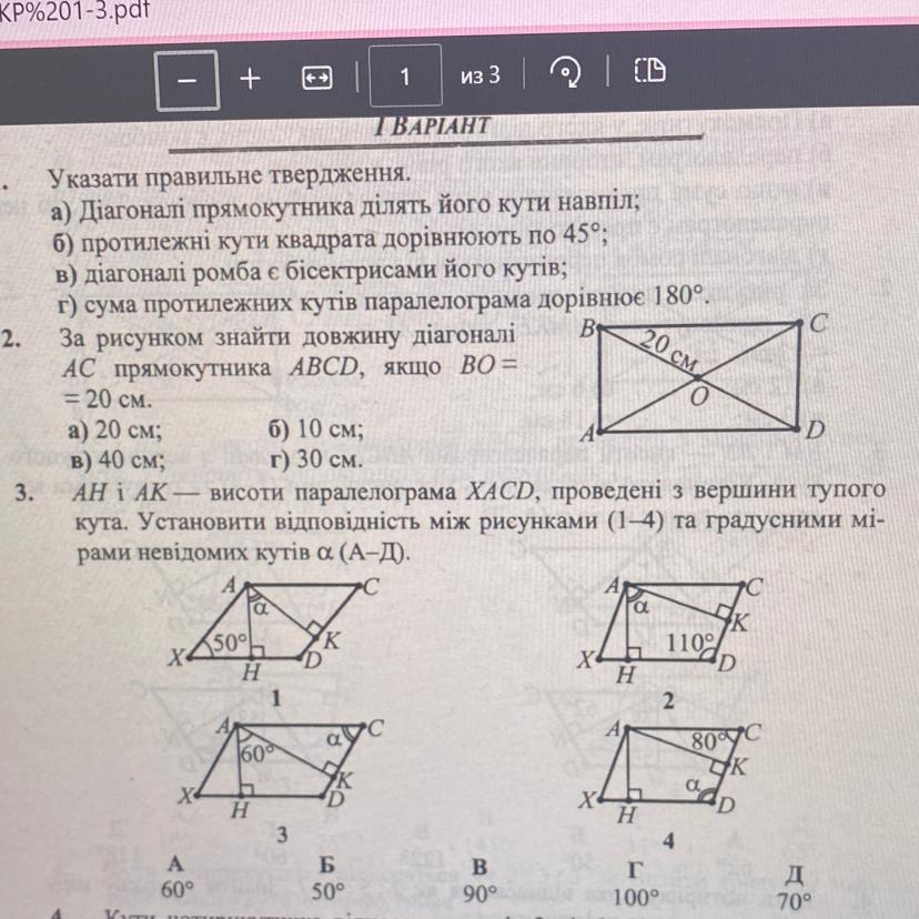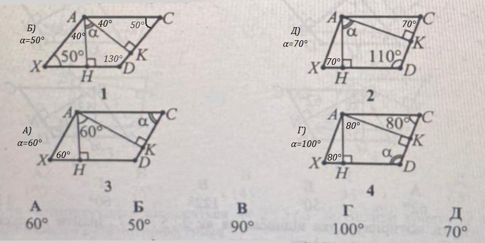 3) Угол между высотами АН и АК параллелограмма равен α=60° . Значит и острые углы параллелограмма равны ∠Х = ∠С = 60° .
