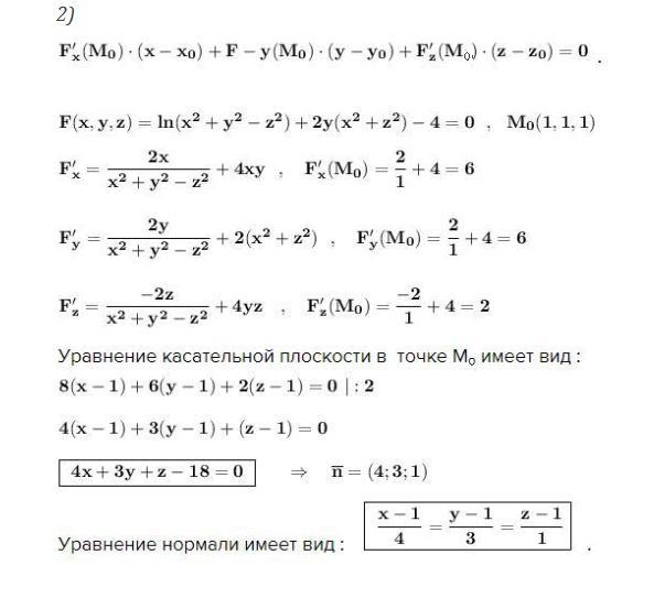 2) Если поверхность задана уравнением F(x,y,z)=0 (т.е. неявно) , то уравнение касательной плоскости к данной поверхности в точке M₀(x₀,y₀,z₀) можно найти по следующей формуле: