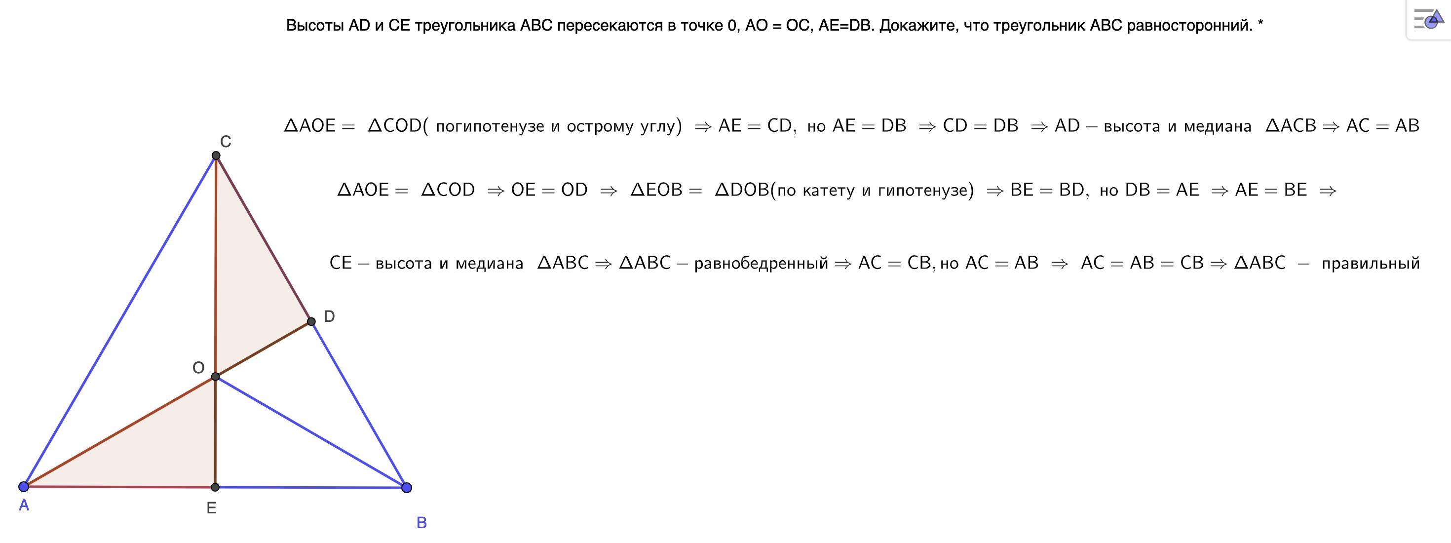 4*. Высоты AD и CE треугольника АВС пересекаются в точке 0, AO = OC, AE=DB. Докажите, что треугольник АВС равносторонний. * даю 33