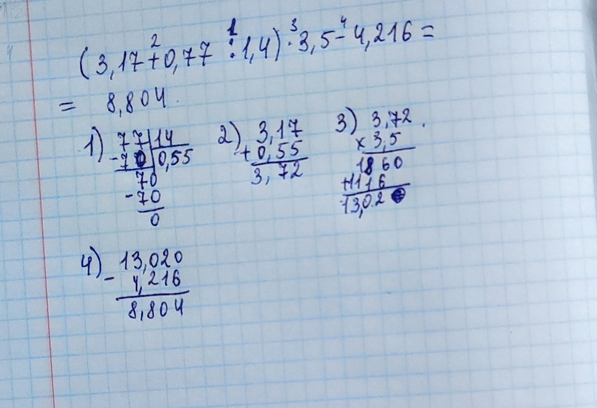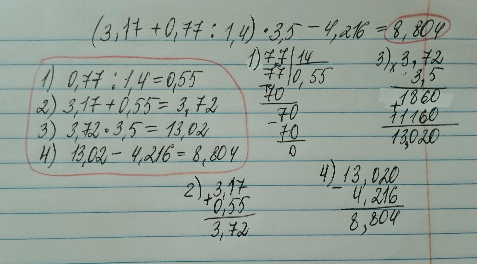 Для того,чтобы решить этот пример вы должны, сначала решить его по действиям тоесть(1,2,3,4 и др) сначала мы должны найти первое действия где скобки там,деления и плюс сначала берем деление это 1 действие потом плюс второе действие,а дальше вы можете увидеть остальные действие на фото там все подробнее написано)