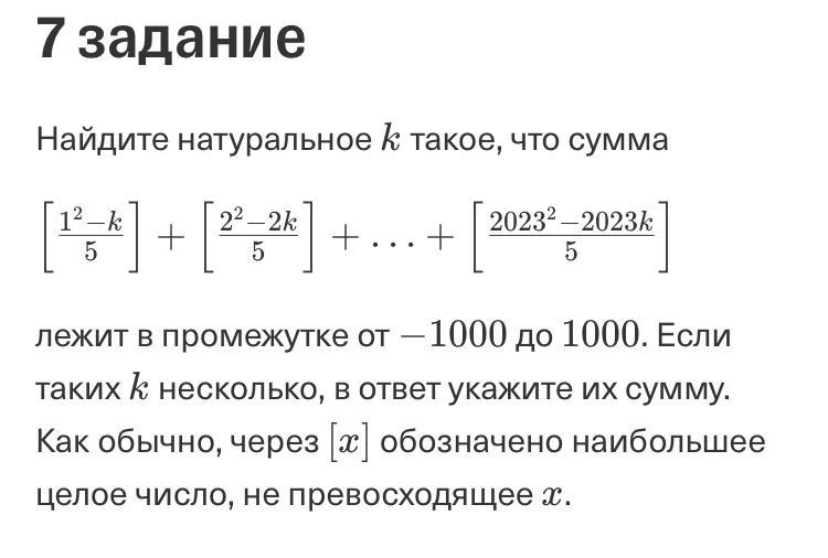 То есть на каждые 5 членов ряда мы вычитаем по 1. Всего в ряду у нас 2023\5=404 полных пятерок и еще "хвостик", так что в итоге мы уменьшим исходное значение ряда не более чем на 405. Так как при k=1349 без взятия целых частей сумма ряда равна 0, то после взятия целых частей будет где-то между -404 и -405, что попадает в коридор от -1000 до 1000