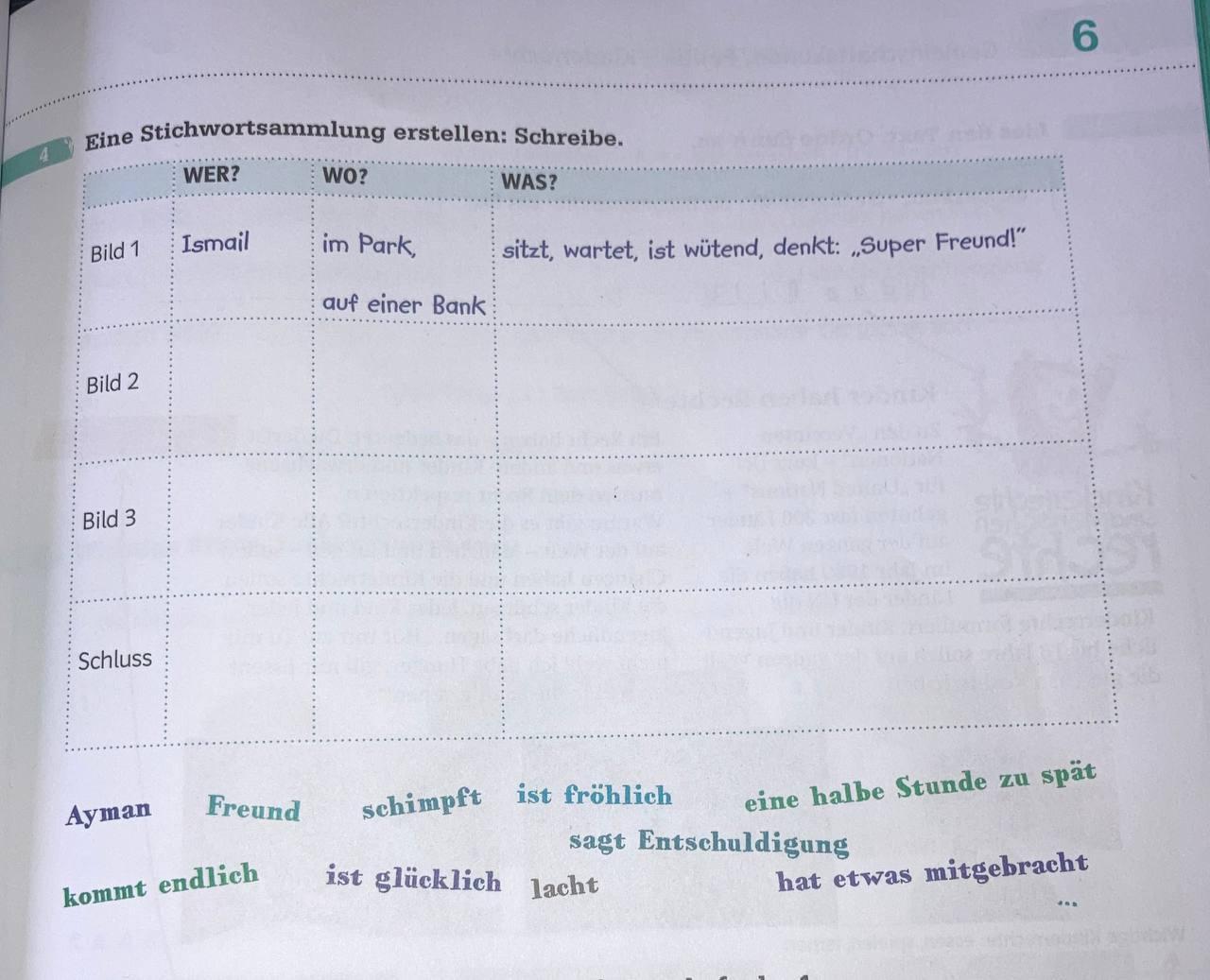 4 Eine Stichwortsammlung erstellen: Schreibe. Bild 1 Bild 2 Bild 3 Schluss Ayman WER? Ismail Freund kommt endlich WO? im Park, auf einer Bank WAS? sitzt, wartet, ist wütend, denkt: ,,Super Freund!" schimpft ist fröhlich eine halbe Stunde zu spät sagt Entschuldigung hat etwas mitgebracht 6 ist glücklich lacht