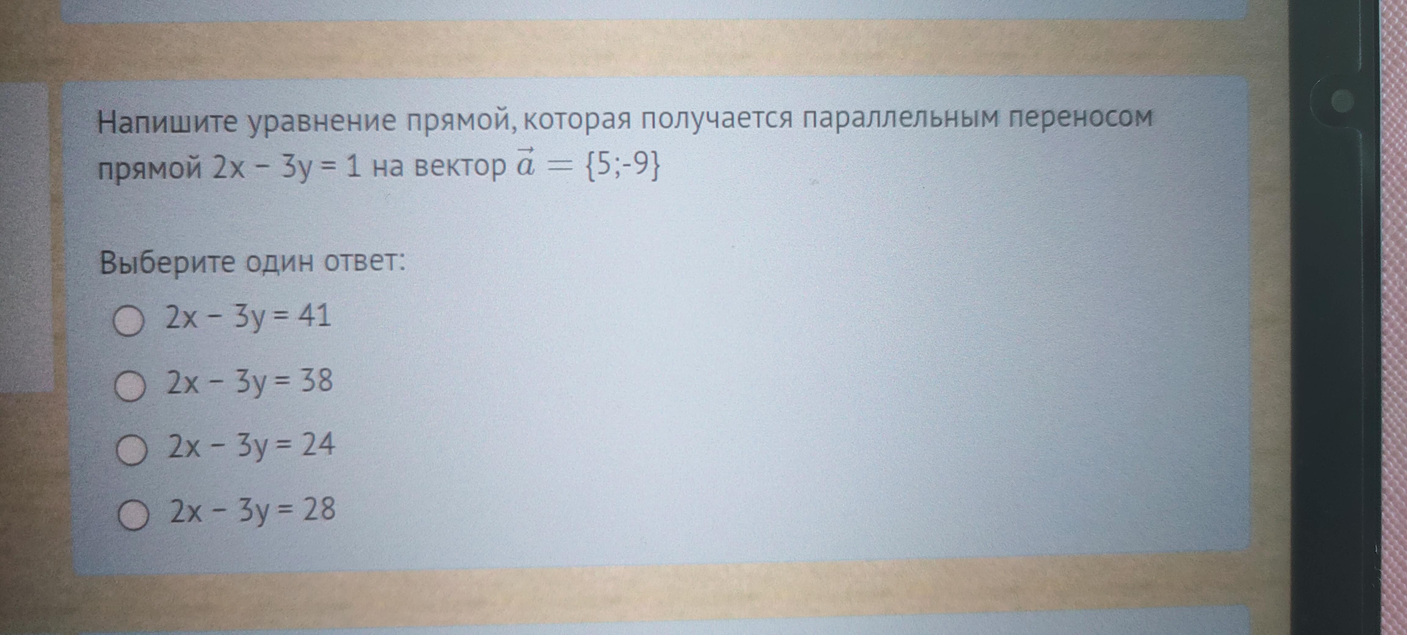 Напишите уравнение прямой, которая получается параллельным переносом прямой 2х-3y=1 на вектор a ={5;-9}