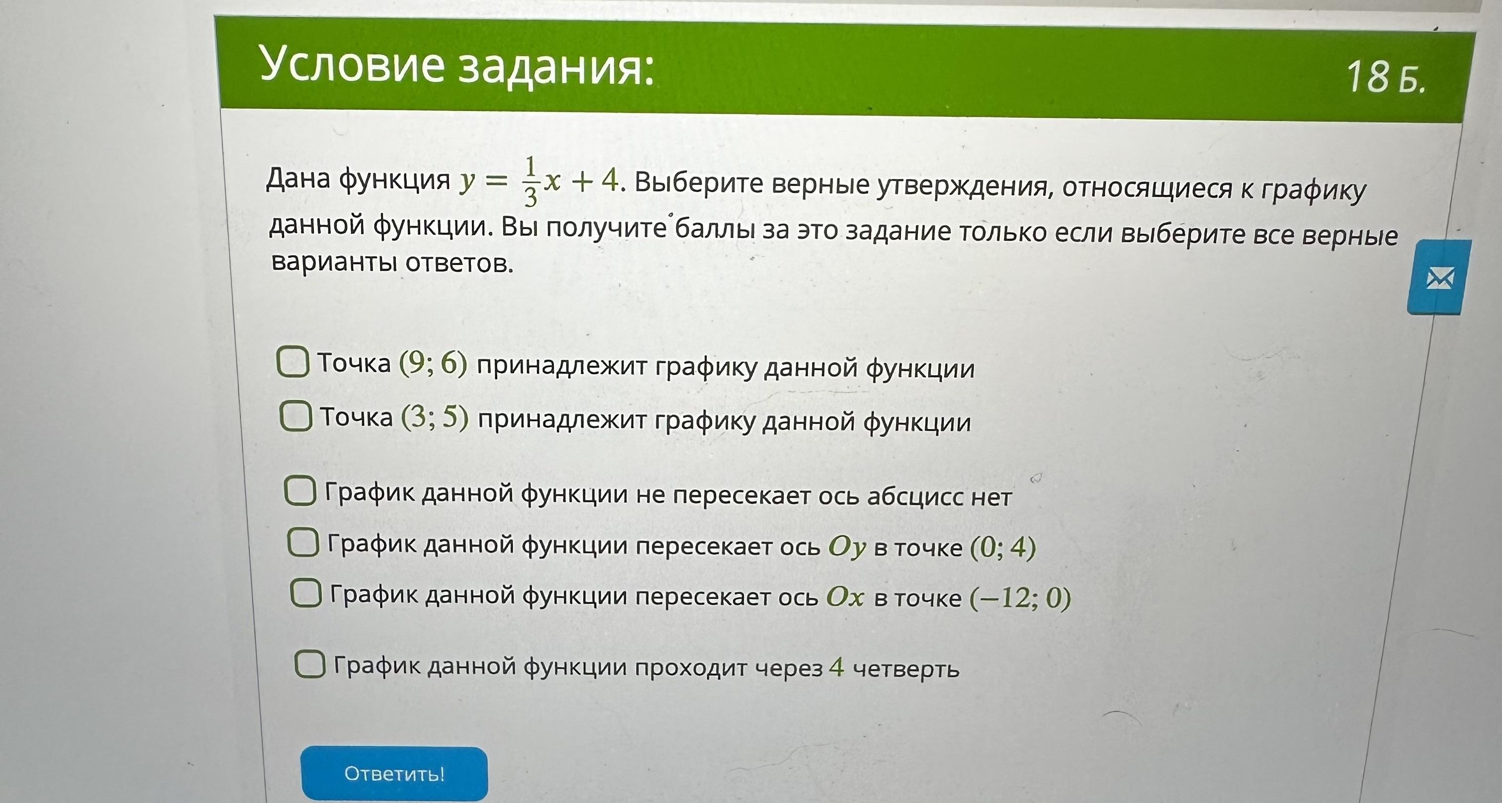 Точка А(9;6) => 6=1/3*9+4; 6=3+4; 6≠7 => НЕ принадлежит.