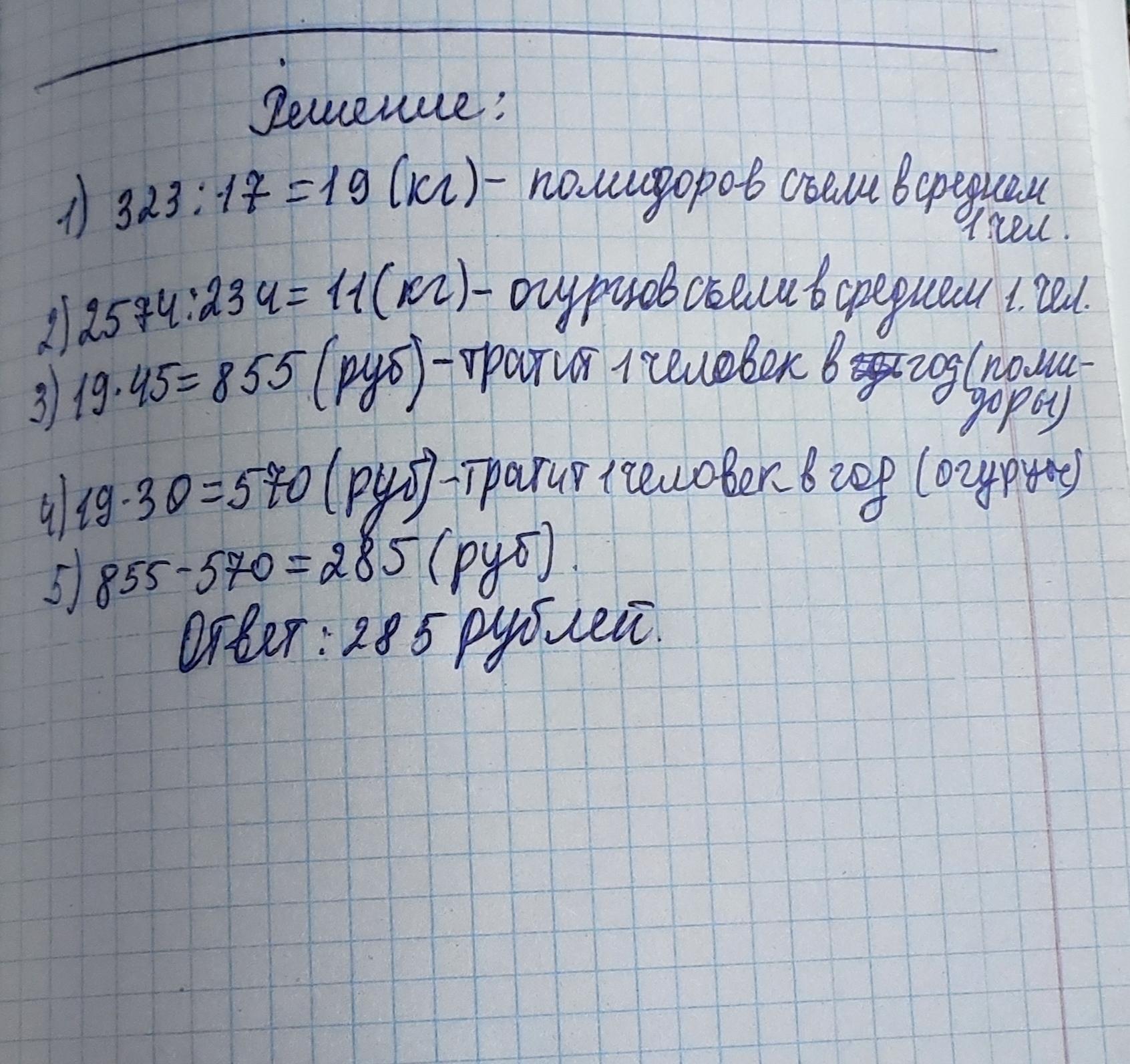17 человек съели за год 323 кг помидоров, а 234 человека съели за год 2574 кг огурцов. Каких овощей в среднем на человека съели в год меньше? Сколько денег за год сэкономил человек, который не любит помидоры и вместо них ел огурцы, если 1 кг помидоров стоит 45 рублей, а 1 кг огурцов 30 рублей?