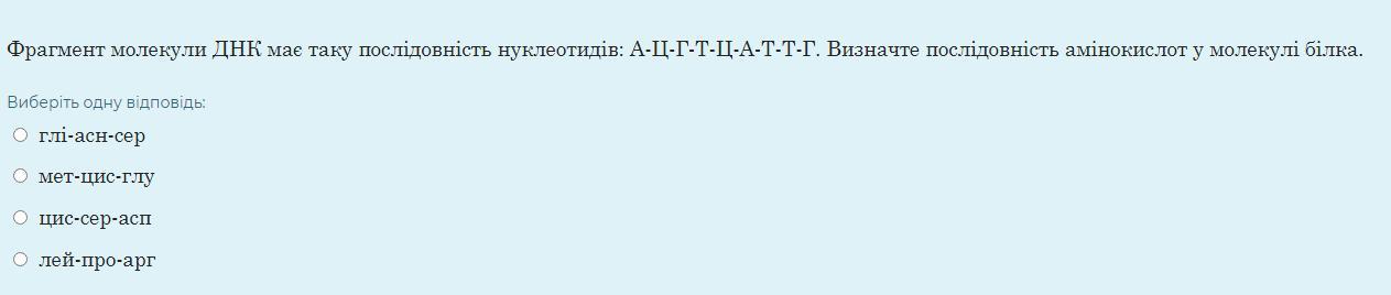 Фрагмент молекули ДНК має таку послідовність нуклеотидів: А-Ц-Г-Т-Ц-А-Т-Т-Г. Визначте послідовність амінокислот у молекулі білка.