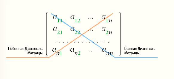 Главная диагональ квадратной матрицы состоит из элементов матрицы, расположенных на диагонали , идущих из левого верхнего угла матрицы в правый нижний угол . Её элементы имеют одинаковые номера строк и столбцов : а₁₁ , а₂₂ , а₃₃ , ... , аₙₙ .