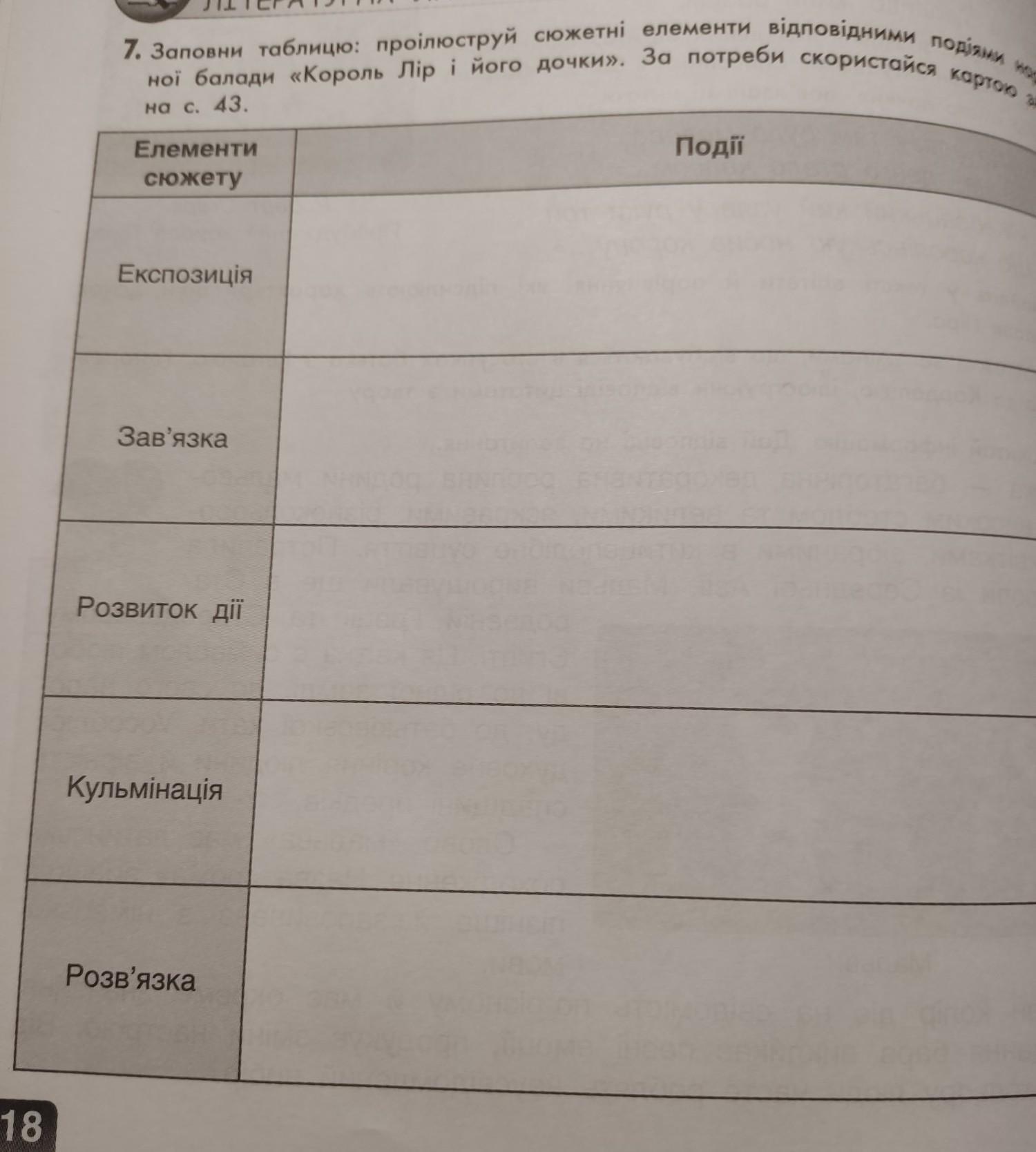 Заповни таблицю: проілюструй сюжетні елементи відповідними подіями народ ноï балади «Король Лір і його дочки». За потреби скористайся картою знань на с. 43. Елементи сюжету Експозиція Зав'язка Розвиток дії Кульмінація Розв'язка Події