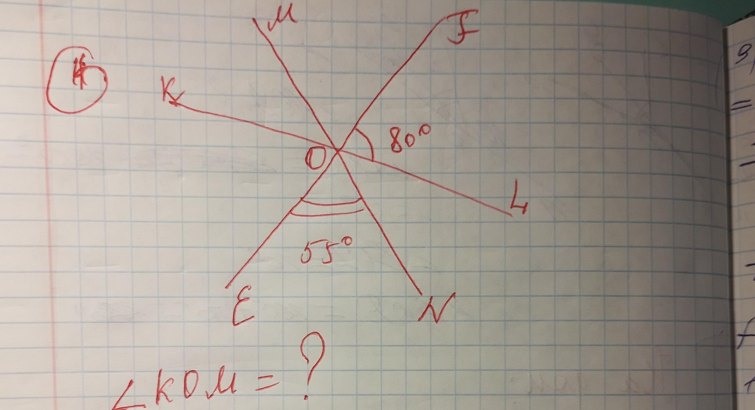 ∠KOM=∠NOL=180°-(∠EON+∠LOF)=180°-(55°+80°)=180°-135°=45°