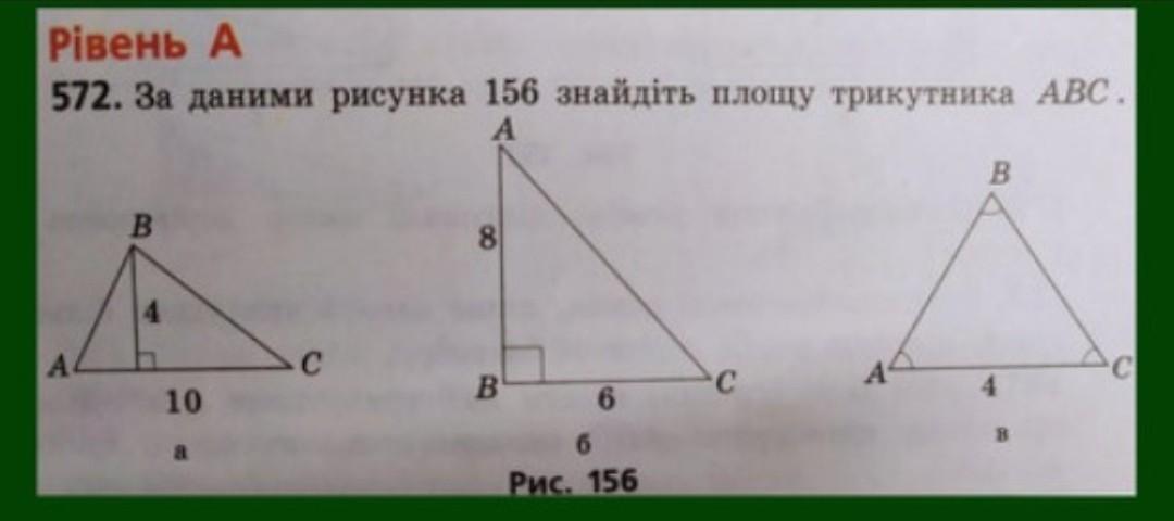 Рівень А 572. За даними рисунка 156 знайдіть площу трикутника АВС. A В 10 8 B 6 Рис. 156 В хелпуйте