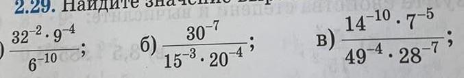 б) 30^(-7)/(15^(-3)*20^(-4)) = (15^3*20^4)/30^7=(15^3*10^4*2^4)/(15^7*2^7) =